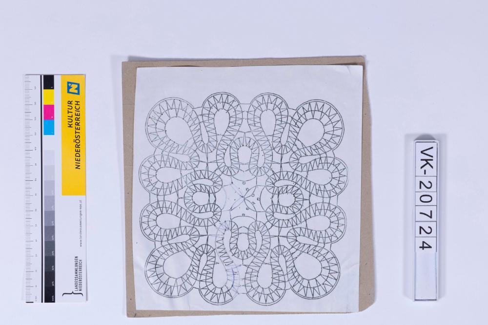 Klöppelmuster für ein rechteckiges Spitzendeckchen mit geschlängeltem Muster, aufgeklebt auf Karton, gelocht. Fr. Bracher veranstaltete in den 1970er- und 1980er-Jahren Klöppelkurse über den ÖFB.