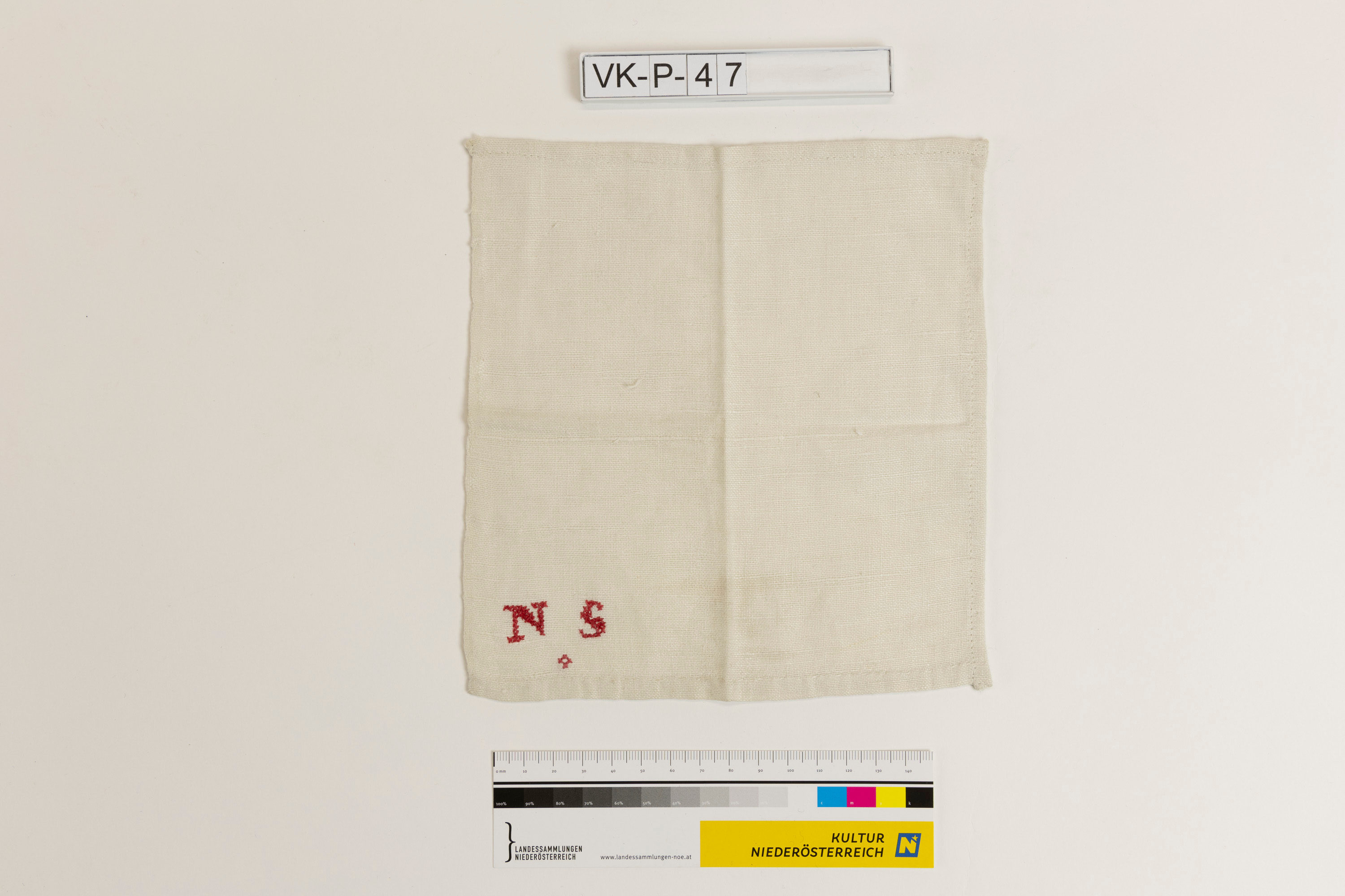 Weißes Stofftaschentuch aus Leinen mit Monogrammstickerei in rotem Kreuzstich: "NS".