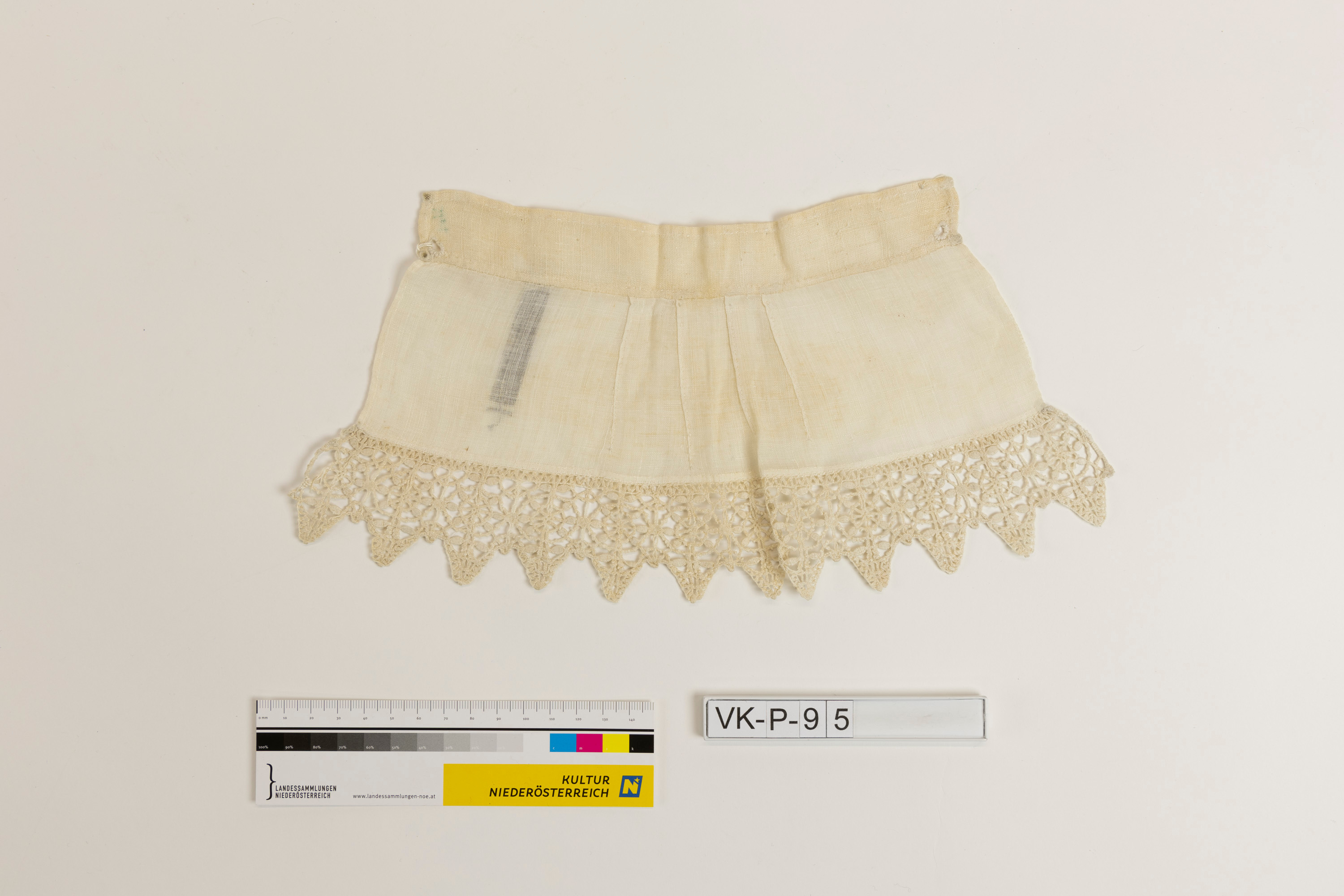 Manschette mit Knopflöchern aus weißem Glasleinen, vierfach abgenäht, besetzt mit einer gezackt abschließenden ornamental gestalteten Häkelspitze in Brügger Technik.