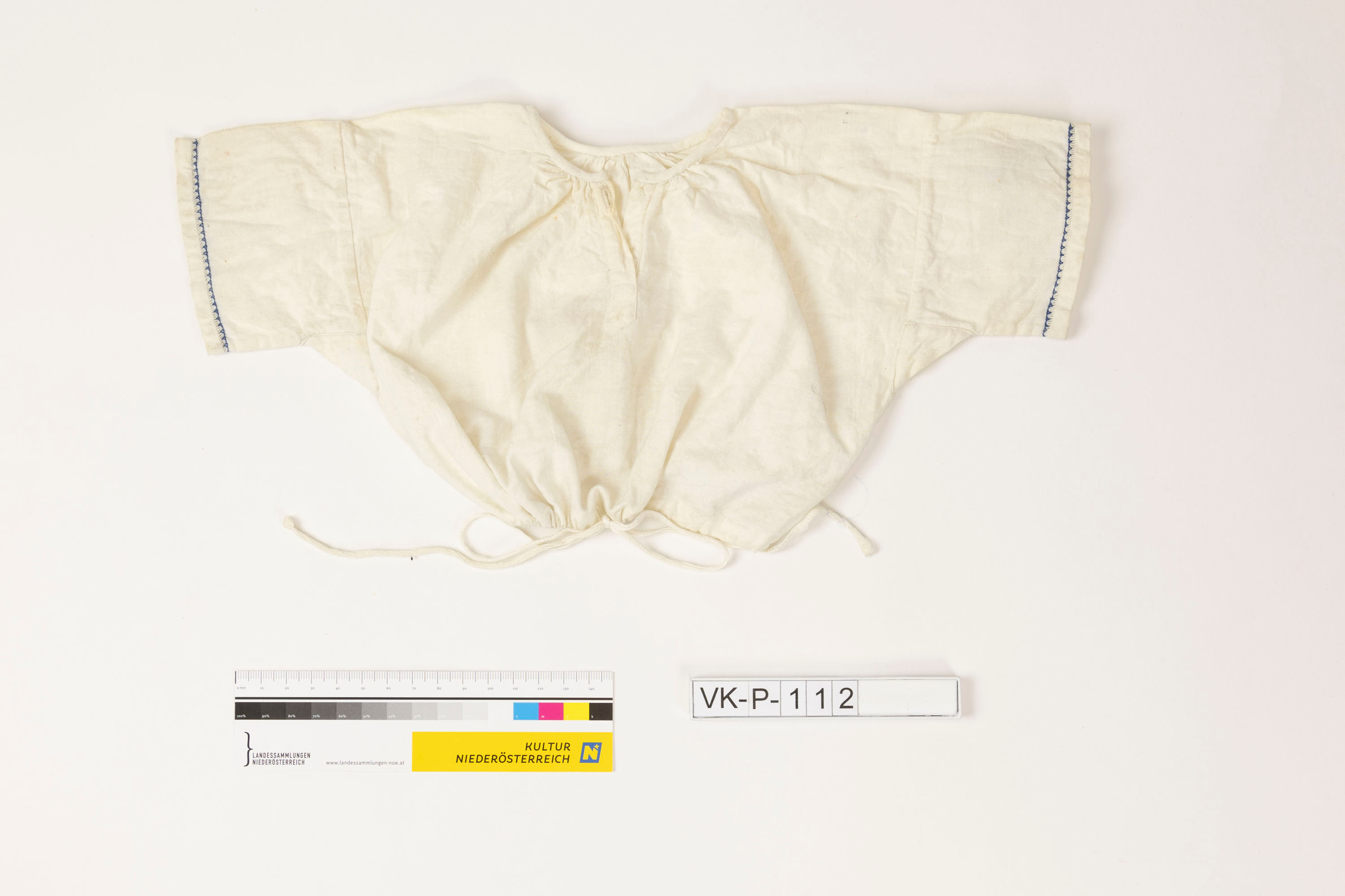 Weiße kurze Puppenbluse aus Leinen mit Zugbändchen und dunkelblauer Ajourstickerei an den Ärmelabschlüssen.