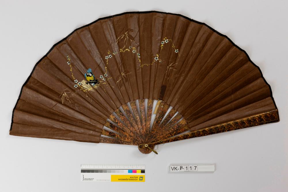 Fächer mit geraden Holzbögen, die mit einer Marmorlasur in Brauntönen lackiert sind. Die Bespannung ist aus braunem Baumwollchintz und mit einem Blütenmuster sowie einem Wellensittich mehrfärbig bemalt.