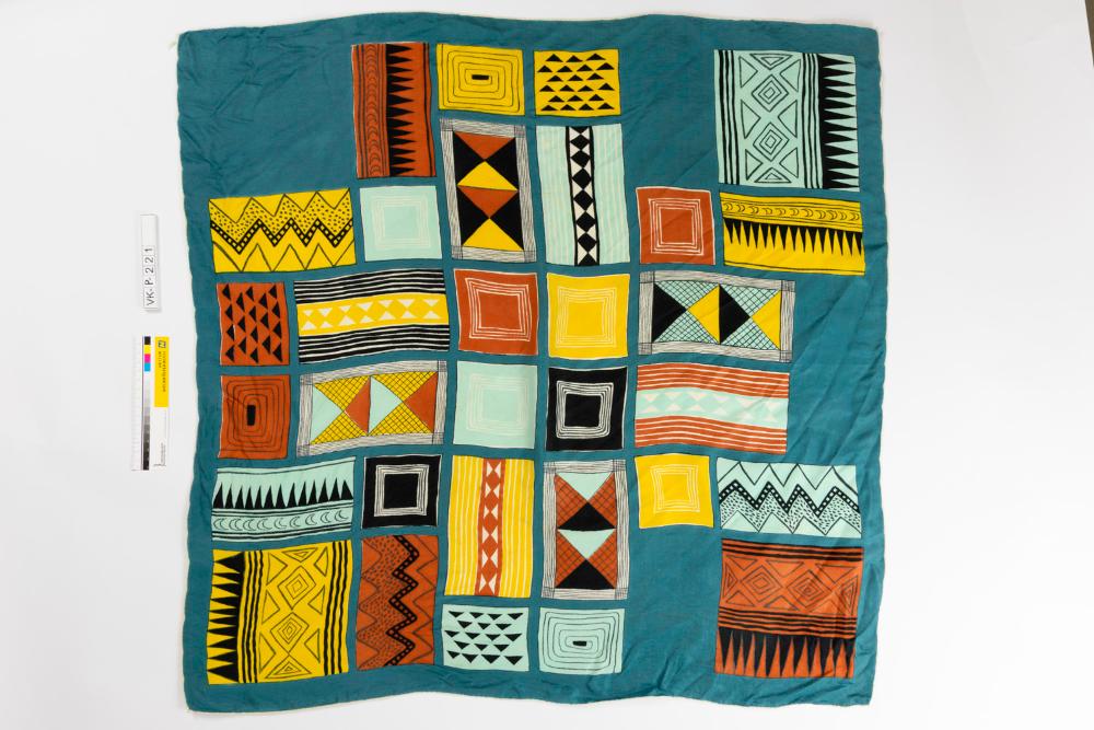 Seidentuch mit blaugrüner Grundfarbe, bedruckt mit geometrischen Elementen in verschiedenen Farben. Der Rand ist weiß rolliert.