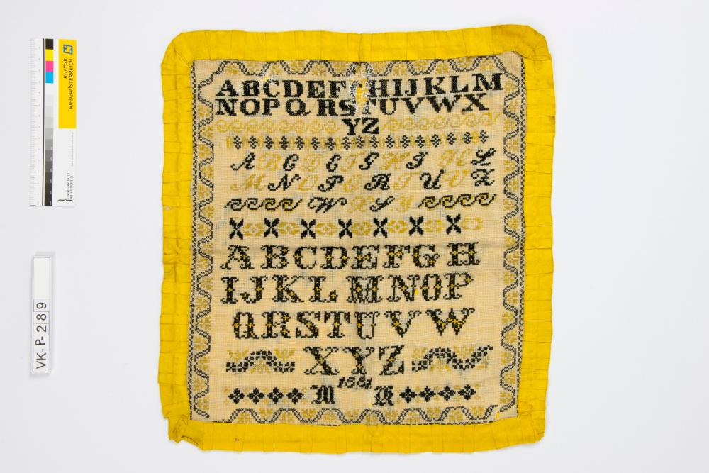 Weißes Stofftuch (mit gelber Taftfaltenrüsche gefasst), mit gelber und schwarzer Stickwolle bestickt: Verschiedene Alphabete, Datierung 1887, Musterborte am Rand.