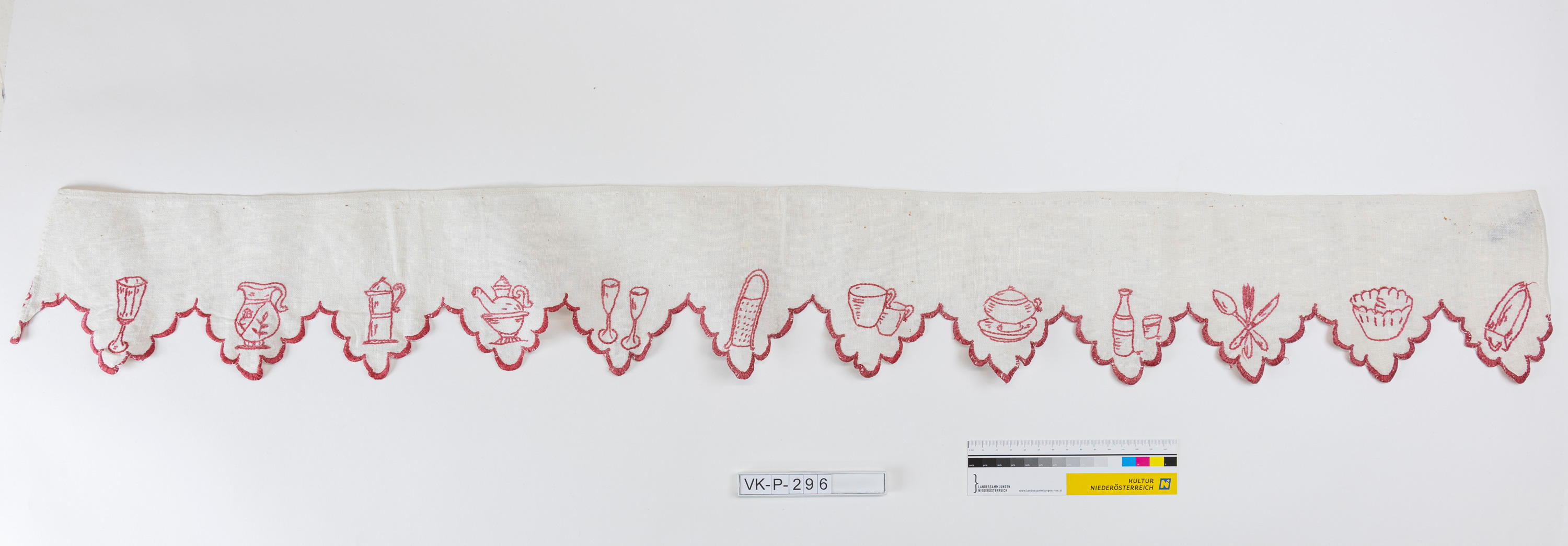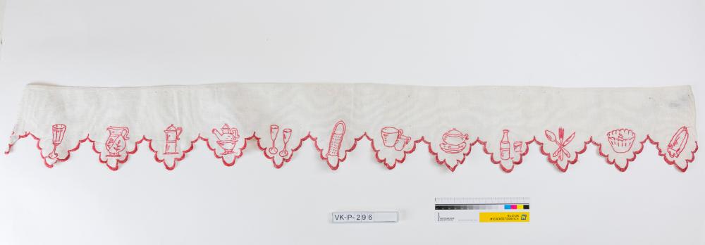 Weißes Kastenband aus Leinen, mit rot gefasster Bogenkante und in rot aufgestickten Küchenutensilien und Geschirrteilen.