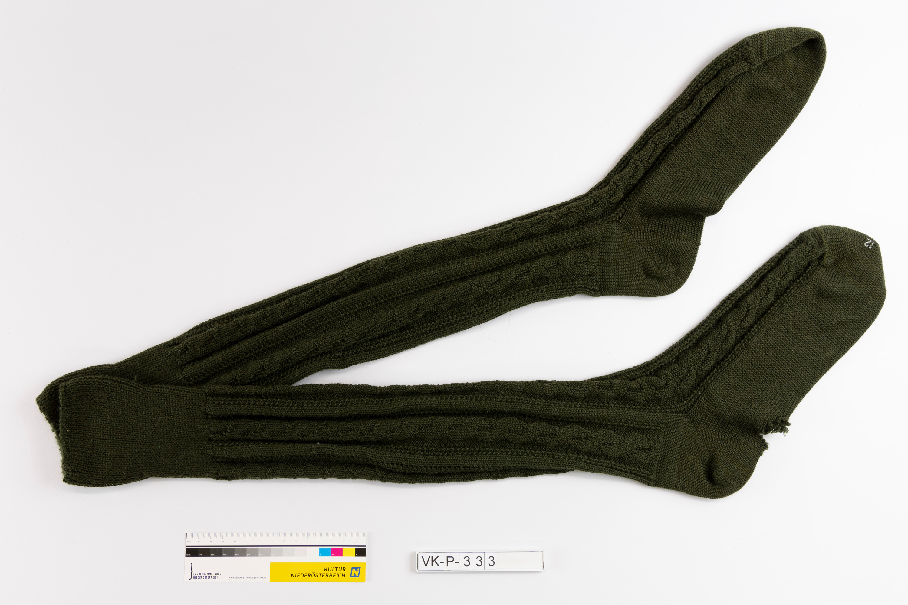 Ein Paar (zusammen genäht) olivgrüne Herrenstutzen aus Schafwolle mit durchgehendem Streifen- und Zopfmuster und Gummizug.