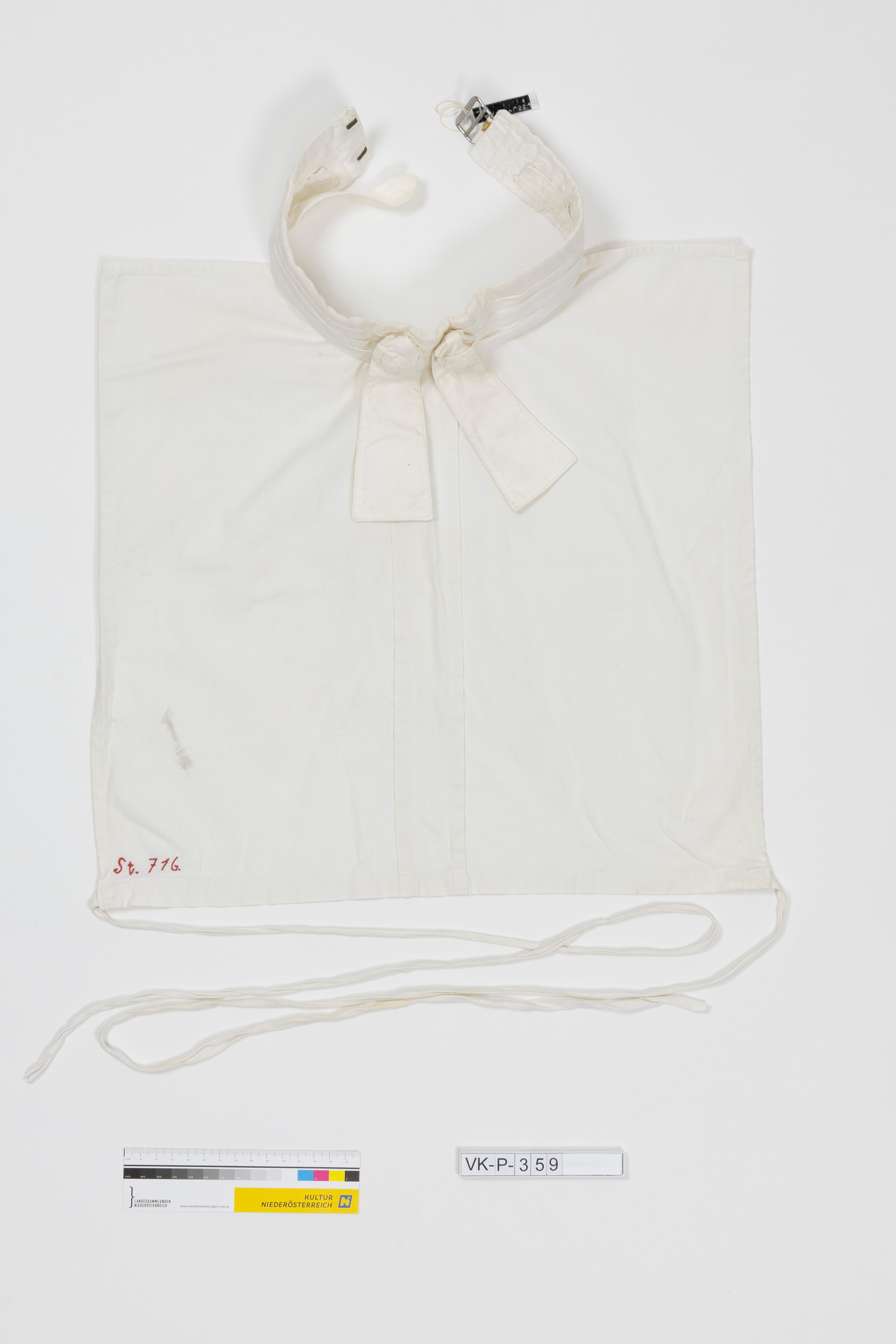 Rechteckiges weißes Feinleinenplastron mit einem Stehkragen (mit Dornschließe), verziert mit zwei Stoffknöpfen mit Bändern. Das Plastron hat über die Mitte zwei Biesen und ist über zwei Bändchen zu binden. In einer Ecke ist das Plastron mit rotem Garn bestickt: "St. 716".