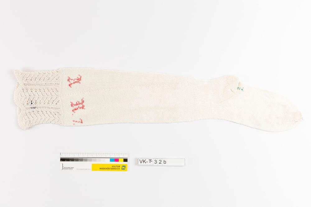 Damenstutzen, glatt gestrickt, mit Blattflächenmuster, Mausezahnrand und roter Bestickung: "AR 7".