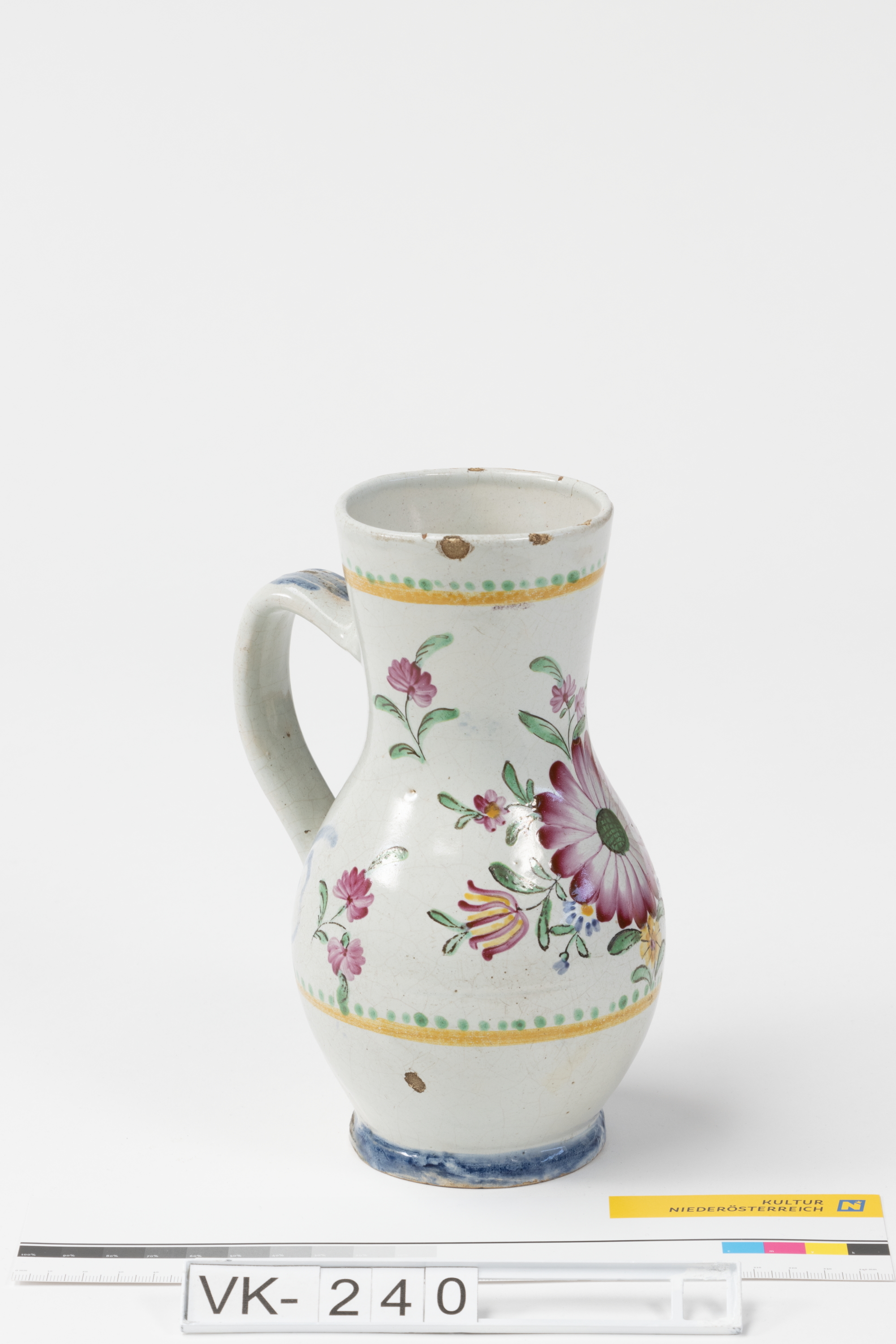 Weiß glasierter bauchiger Krug (Birnkrug) mit unterrandständigem Henkel und mehrfärbiger Bemalung: Eine große rote Blüte, dazu kleinere Blüten und Zierborten.