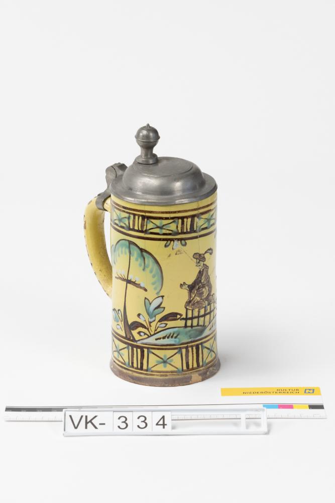 Zylindrisches gelb glasiertes Krügerl mit einem Henkel und einem daran befestigten Zinnklappdeckel mit Knauf; das Krügerl ist in grün, braun und weiß bemalt (floral, Musterborten, eine knieende Person mit Hut).