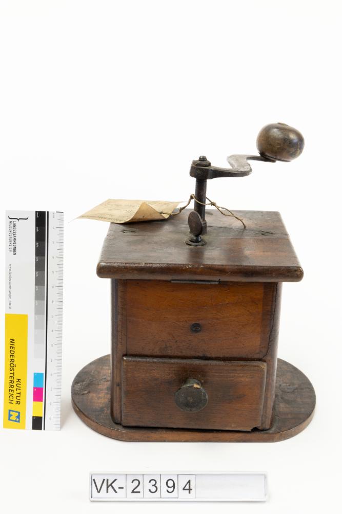 Kaffeemühle mit rechteckigem Holzkasten (VK-2394a), einer Lade (VK-2394b) und einer Handkurbel mit Holzknauf. Das Kästchen hat eine Beschickungsklappe mit Scharnier und kleinem Metallgriff.