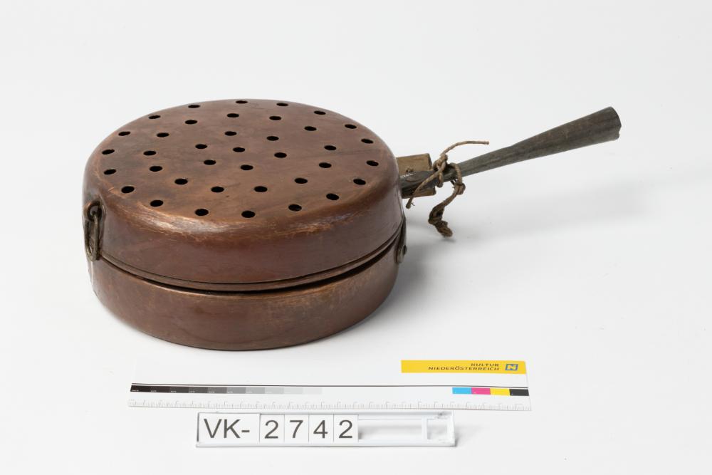 Kupferne Wärmepfanne (Räucherpfanne), zweiteilig mit gelochtem Deckel; die Pfanne hat vernietete Eisenbeschläge und eine konische Tülle für einen Stiel.