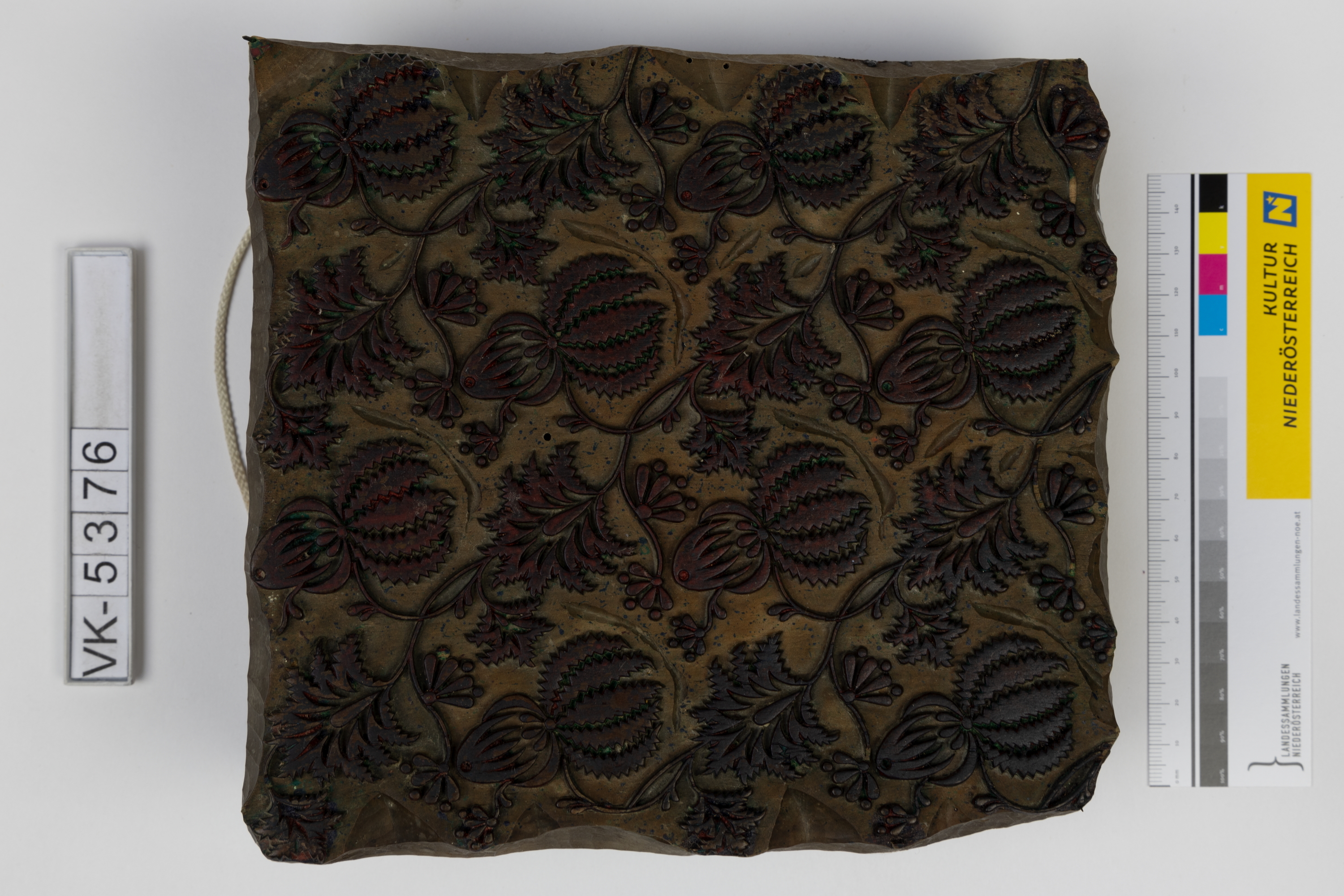 Färbermodel aus Holz mit Metallstiften auf einer Trägerplatte mit zwei Kerben. Druckmuster: Blütenmuster mit Blattranken, mit Resten roter und grüner Farbe.