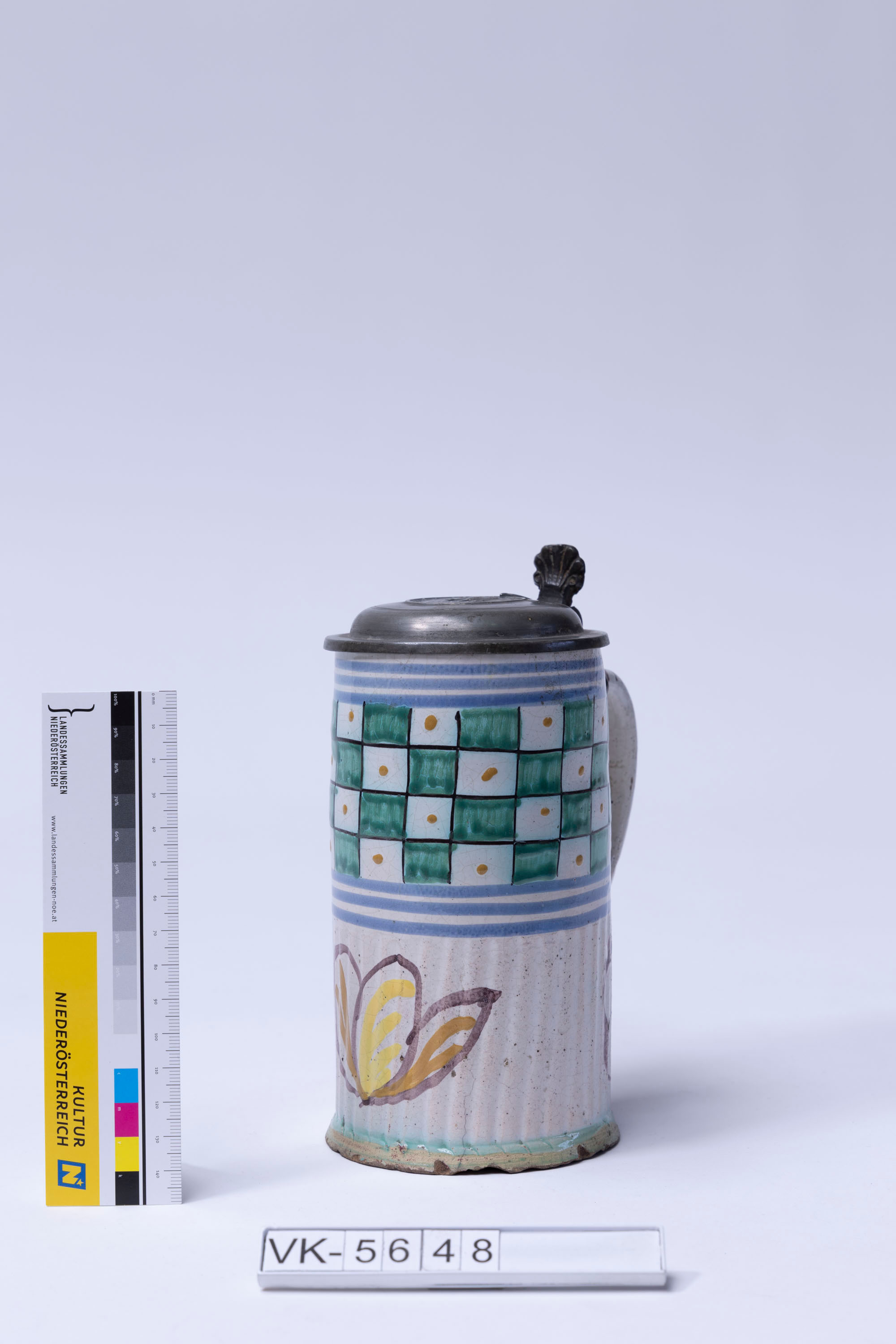 Zylindrisches Krügerl, im unteren Drittel gerippt, mit einem Henkel und einem darauf befestigten Zinnklappdeckel. Das Krügerl ist in der oberen Hälfte grün und weiß mit gelben Punkten schachbrettartig bemalt und hat in der unteren Hälfte einfache stilisierte Blütendekore, auf dem Deckel ist ein medaillenförmiges Halbrelief mit Adam und Eva, "ADAM 1774 EVA".