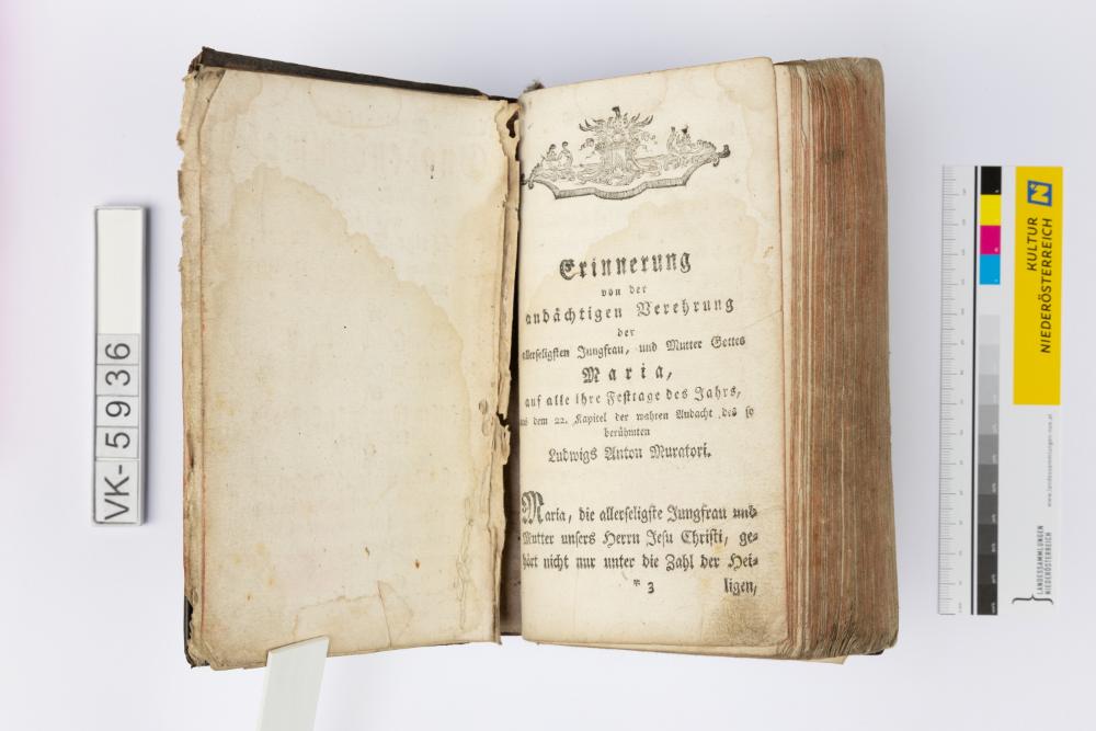 Gebetsbuch in braunem Ledereinband "Marianischer Gnadenhimmel mit zwöf Sternen gezieret ...", 476 Seiten. Im Umschlag sind verschiedene handschriftliche Notizen geschrieben, u. a. "Antonia geboren an 17. September 1799 ...".