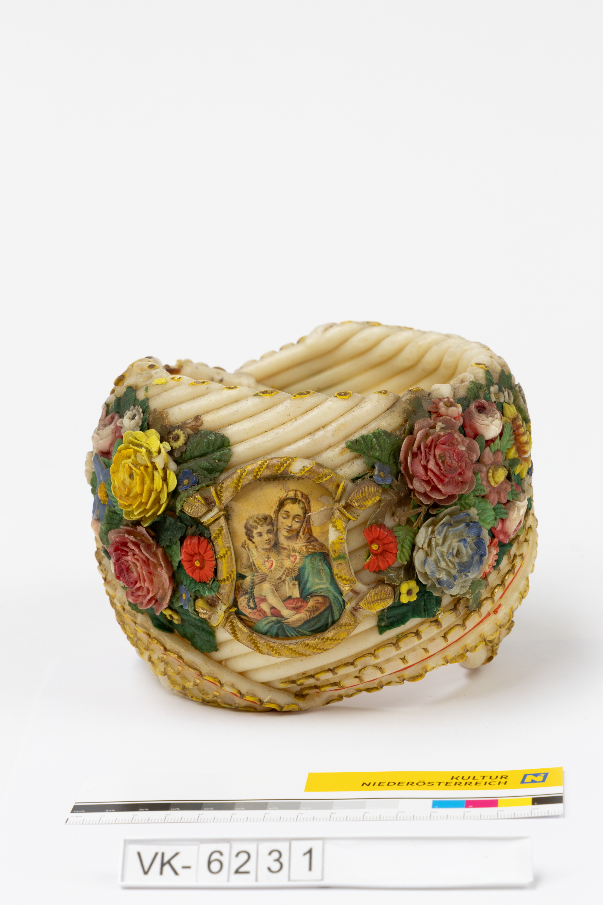Annähernd zylindrischer Wachsstock in geflochtener Legung, die gesamte Außenfläche ist mit Bortenzier, mehrfärbigen dicht gesetzten Wachsblüten und zwei Motiven verziert: Auf einer Seite ein Kreuz mit Buch und flammendem Herz, darunter "R:G", auf der anderen Seite ein eingesetztes Papierbildchen: Maria mit Kind.