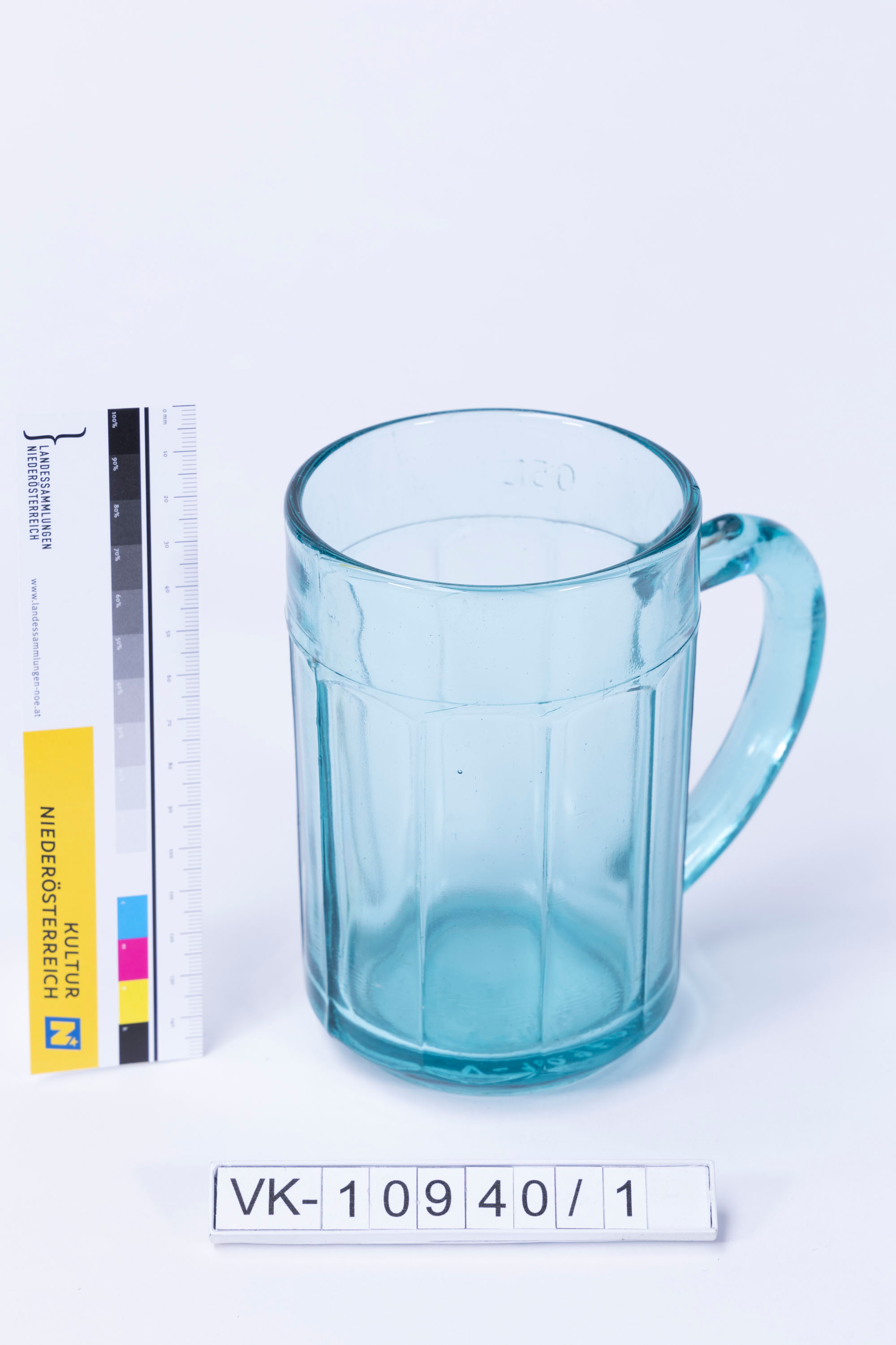 Blaugrünes Bierglas mit Henkel, bis auf den Rand senkrecht profiliert mit eingegossener Beschriftung: Eichstrich und Maßzahl.