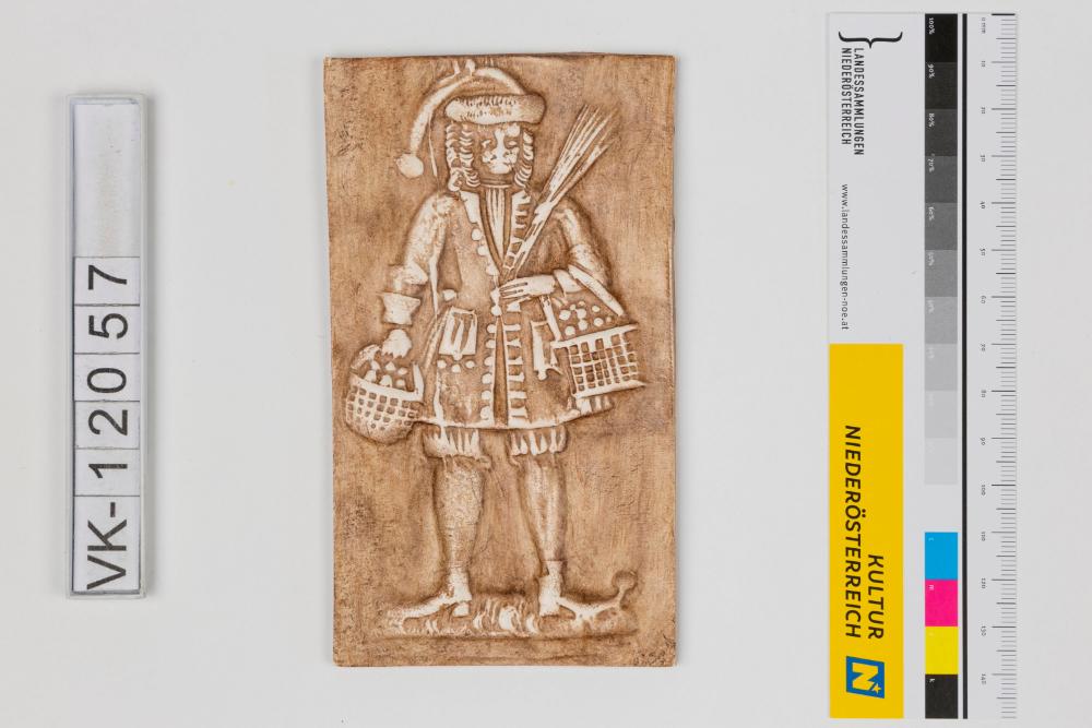 Abdruck eines Lebzeltermodels aus dem Bauernmuseum Illerbeuren, dargestellt ist ein Mann mit zwei Eierkörben. Das Model stammt aus dem 19. Jhdt.