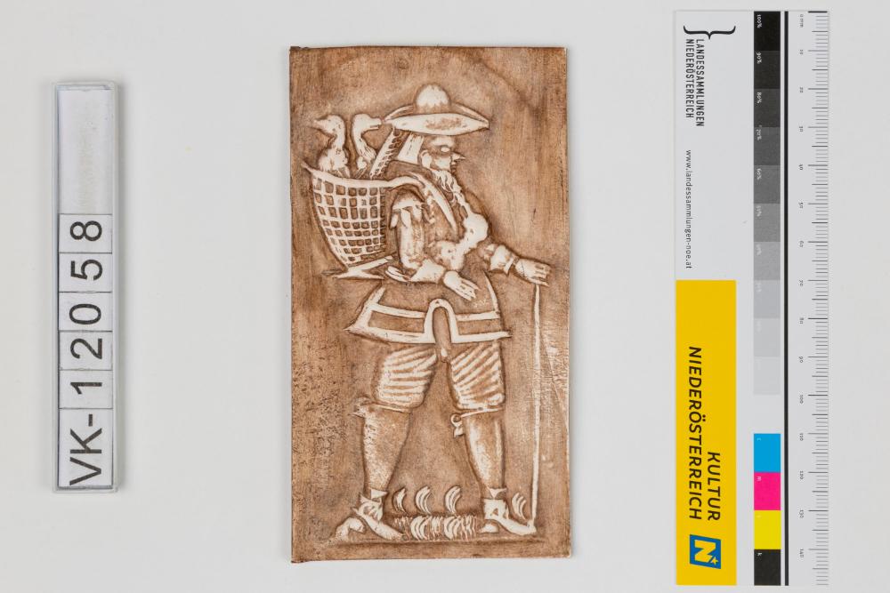 Abdruck eines Lebzeltermodels aus dem Bauernmuseum Illerbeuren, dargestellt ist ein Mann mit einem Rückentragekorb mit Gänsen. Das Model stammt aus dem 19. Jhdt.