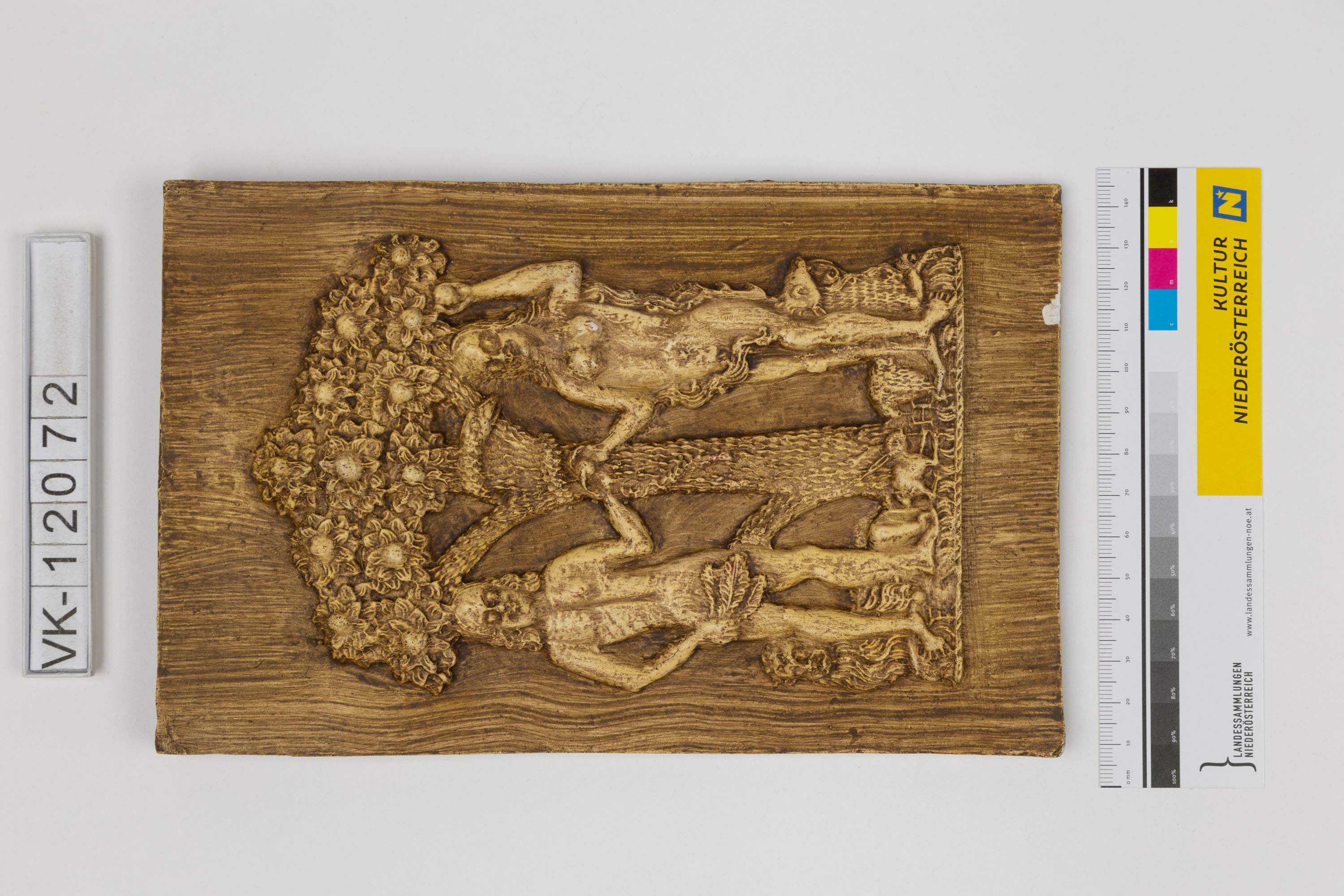 Abguss eines Lebzeltermodels mit der Darstellung von Adam und Eva unter dem Baum der Erkenntnis. Auf der Rückseite ist ein Stempel: "ÖSTERREICHISCHES MUSEUM FÜR VOLKSKUNDE ...".