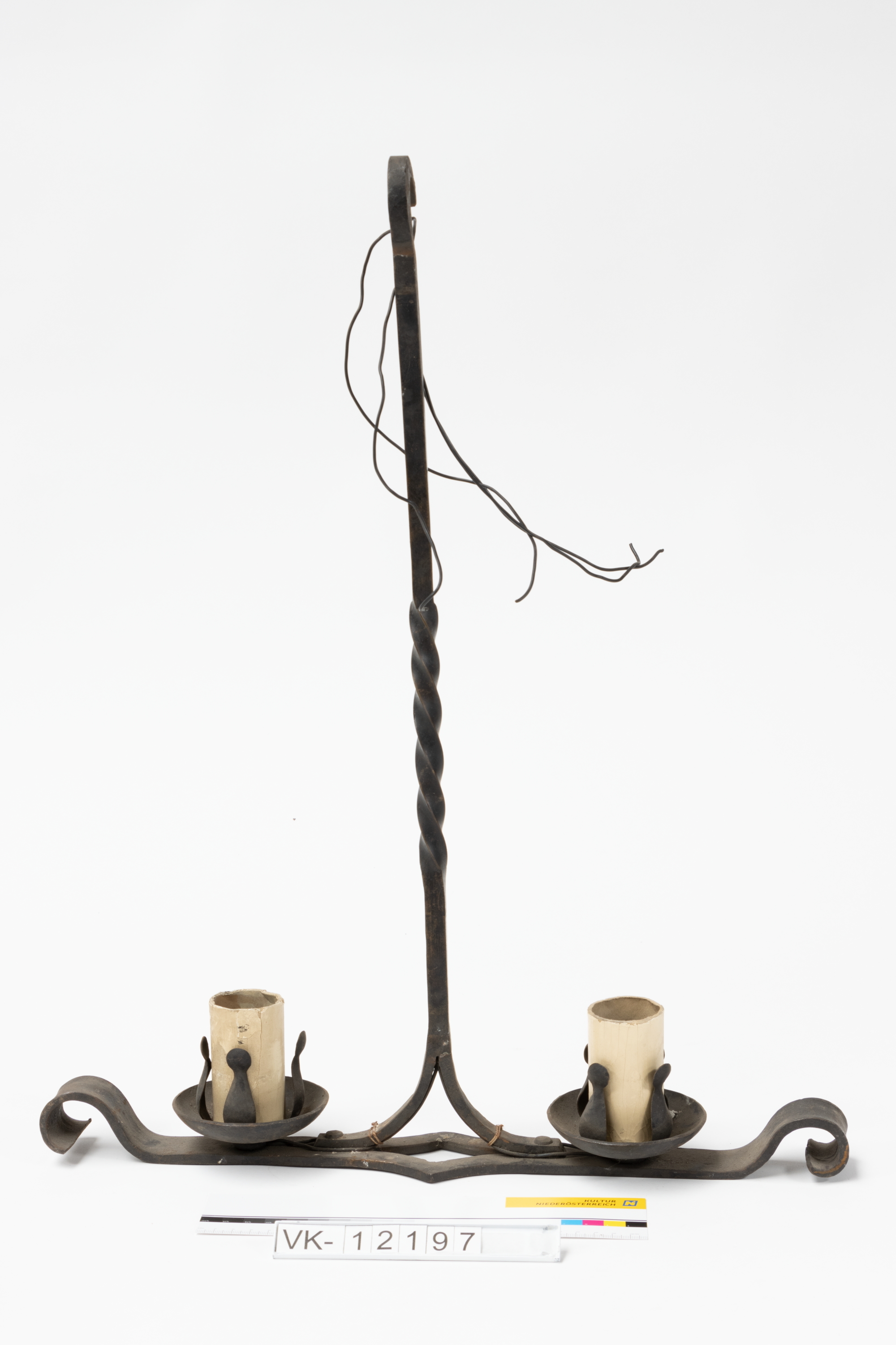 Kerzenleuchter für zwei Kerzen, Schmiedeeisen mit geschwungenen Abschlüssen und einer langen, im mittleren Bereich gedrehten Aufhängung. In den Leuchter sind zwei beige lackierte Kartonröhrchen als Kerzenattrappe eingesetzt.