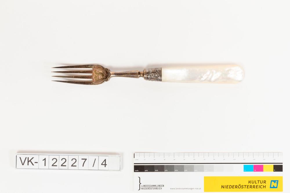 Vierzinkige Gabel aus Silber mit ornamental-floraler Verzierung, mit eingesetztem Perlmuttheft. Die Gabel ist am Schaft punziert: Krönchen, Löwe, "f", "JDWD".