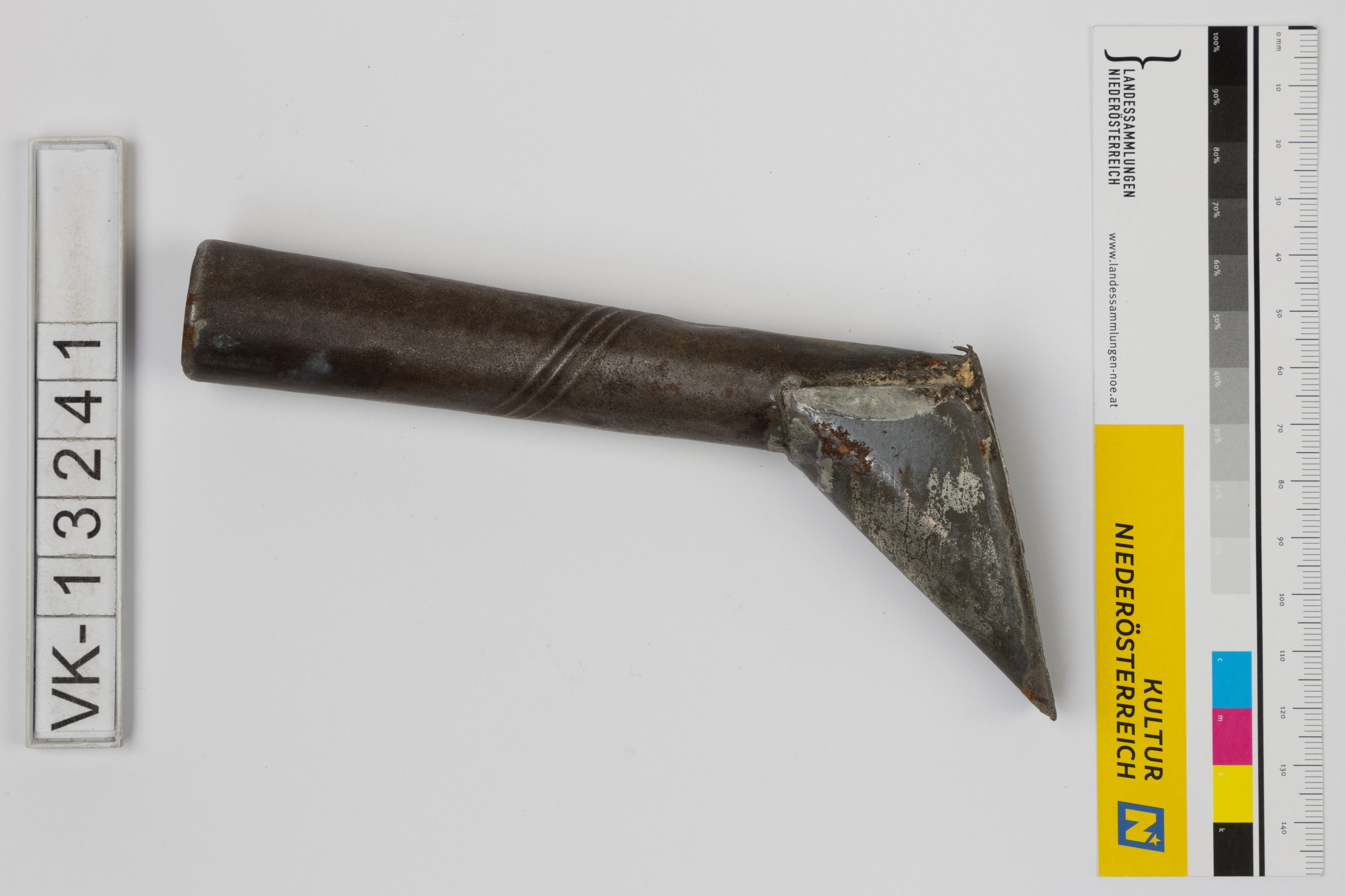 Zylindrischer Blechgriff mit angelötetem Stützblech. Laut Inventarliste handelt es sich um eine Backröhre. Das Objekt stammt laut Inventarliste aus einer Bäckereieinrichtung.