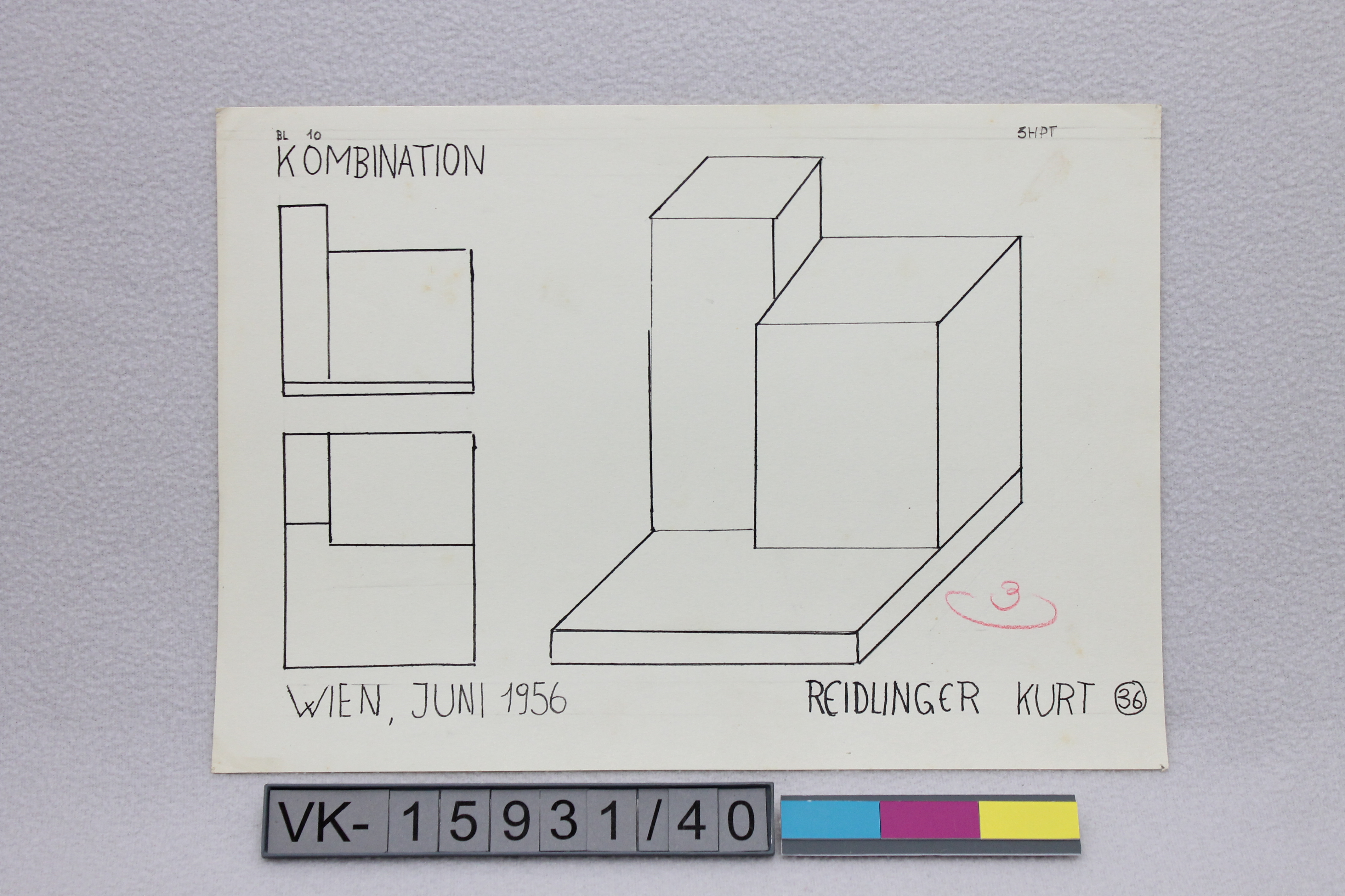 Filzstiftzeichnung auf Papier: "... KOMBINATION ...", geometrische Zeichungen, darunter: "WIEN, JUNI 1956 REIDLINGER KURT". Die Zeichnung stammt von Kurt Reidlinger, geboren 1943 in Straßhof, aus seiner Hauptschulzeit bei den Schulbrüdern. Die Zeichnung befindet sich in der Mappe mit der Inventarnummer VK-22583.