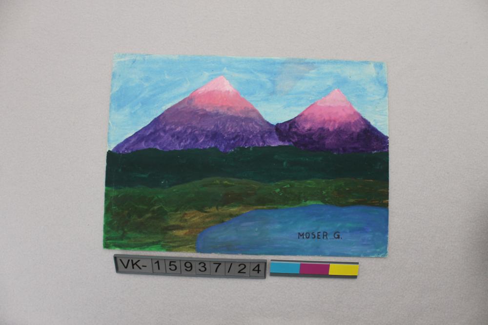 Deckfarbe auf Papier: Landschaft mit zwei violetten Bergen. Darunter: "MOSER G.". Das Bild stammt von Gertrude Moser (später Reidlinger), geboren am 20.1.1945 aus ihrer Volksschulzeit in Viehdorf/Amstetten.