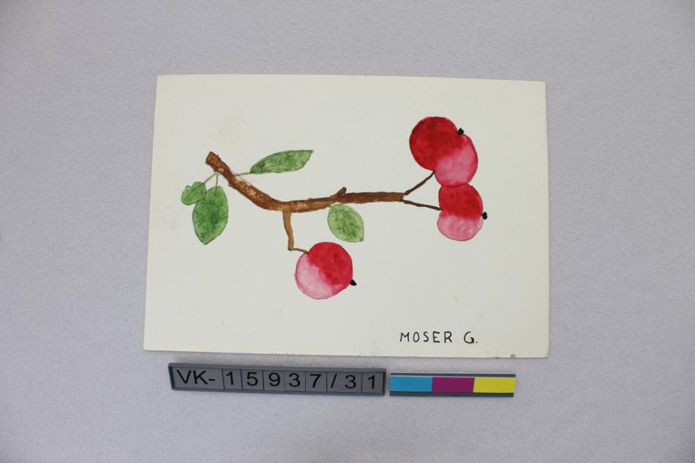 Deckfarbe auf Papier: Zweig mit Blättern und Äpfeln. Darunter: "MOSER G.". Das Bild stammt von Gertrude Moser (später Reidlinger), geboren am 20.1.1945 aus ihrer Volksschulzeit in Viehdorf/Amstetten.