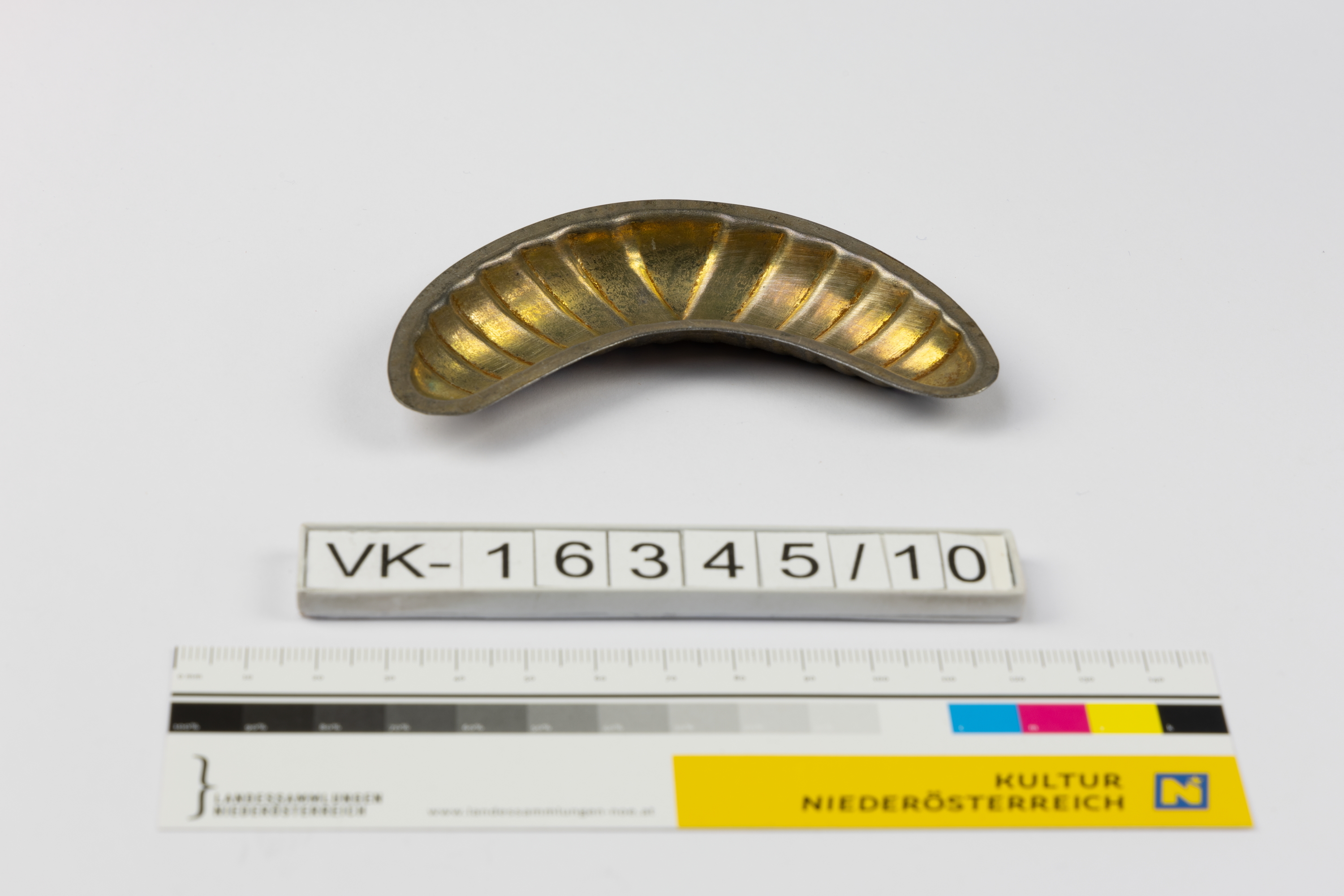Kleine Backform in Form eines Kipferls mit Struktur, gepresst aus verzinktem Eisenblech.