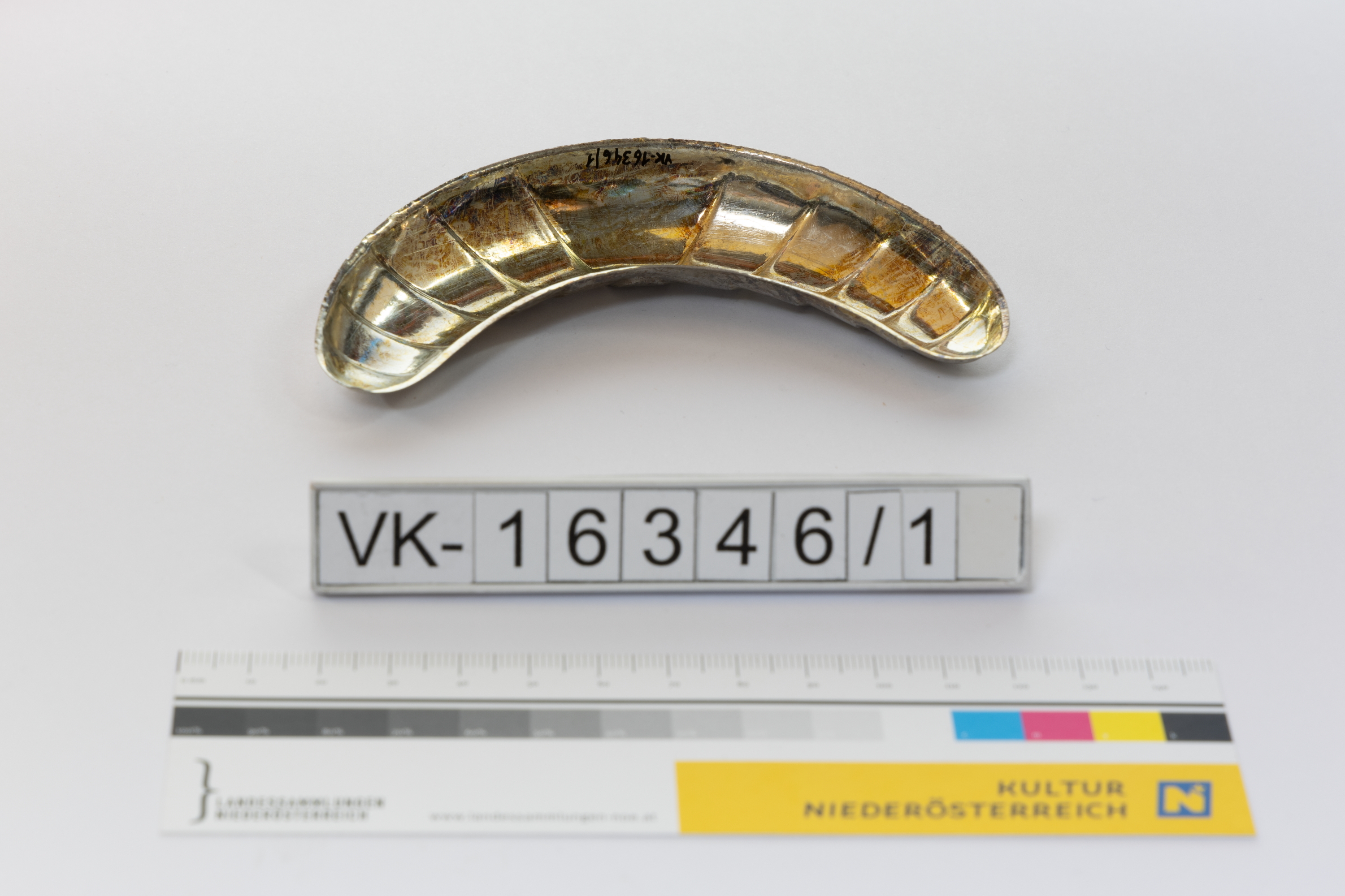 Kleine Backform in Form eines Kipferls mit Struktur, gepresst aus verzinktem Eisenblech.
