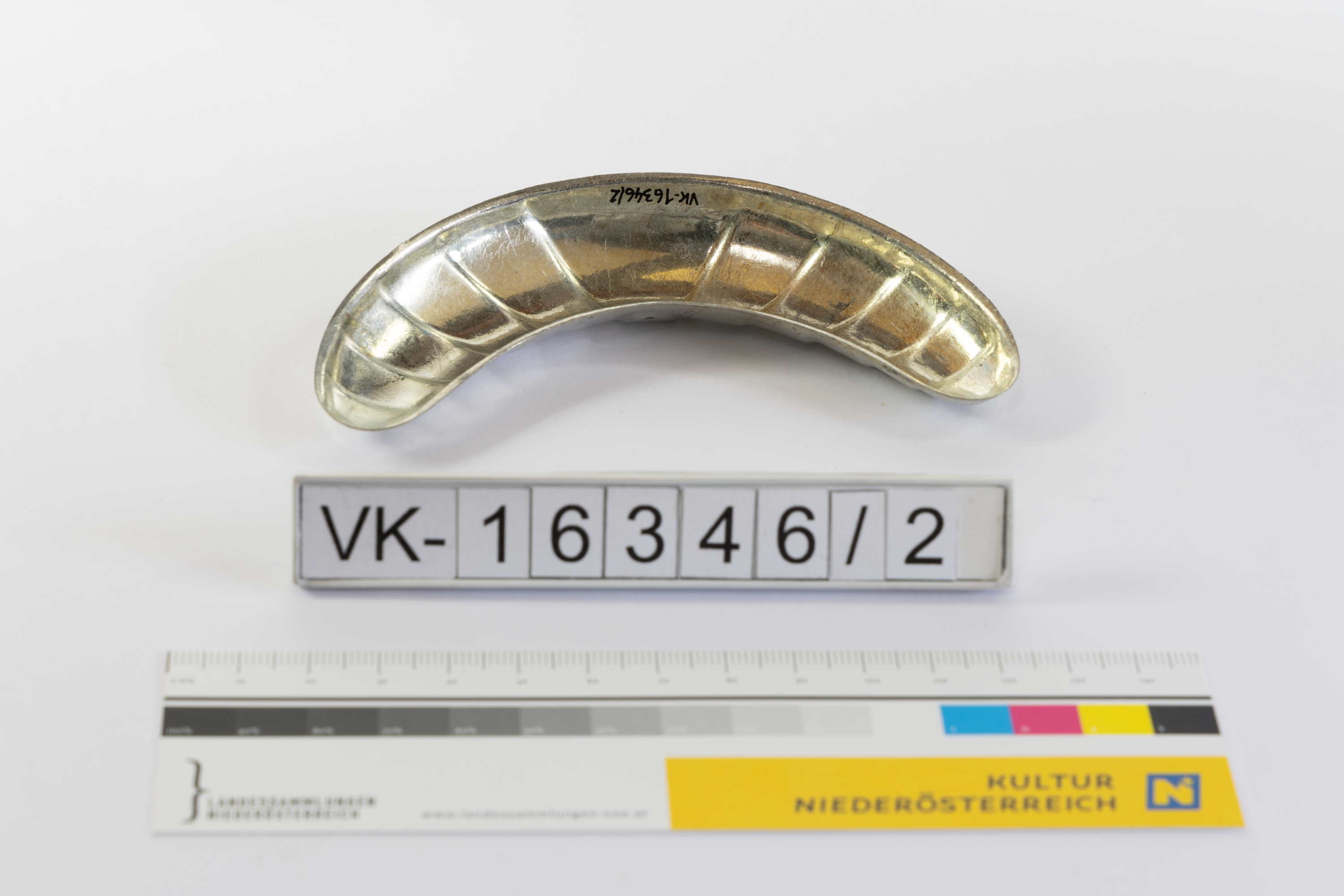 Kleine Backform in Form eines Kipferls mit Struktur, gepresst aus verzinktem Eisenblech.