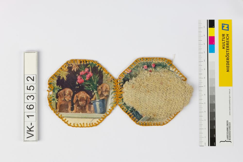 Nadelbriefchen aus zwei achteckigen Kartonscheiben, die mit ockerfarbenem Garn umstochen und aufklappbar verbunden sind. Die Kartonscheiben sind beidseitig mehrfärbig bedruckt, dargestellt sind kleine Hunde und kleine Kinder; als Polster ist ein Wattebausch in Gaze eingelegt.