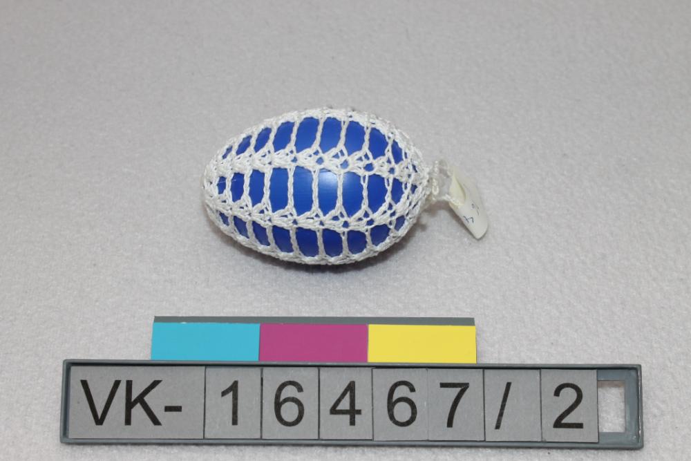Mit weißem Garn durchbrochen umhäkeltes, blau gefärbtes Ei.