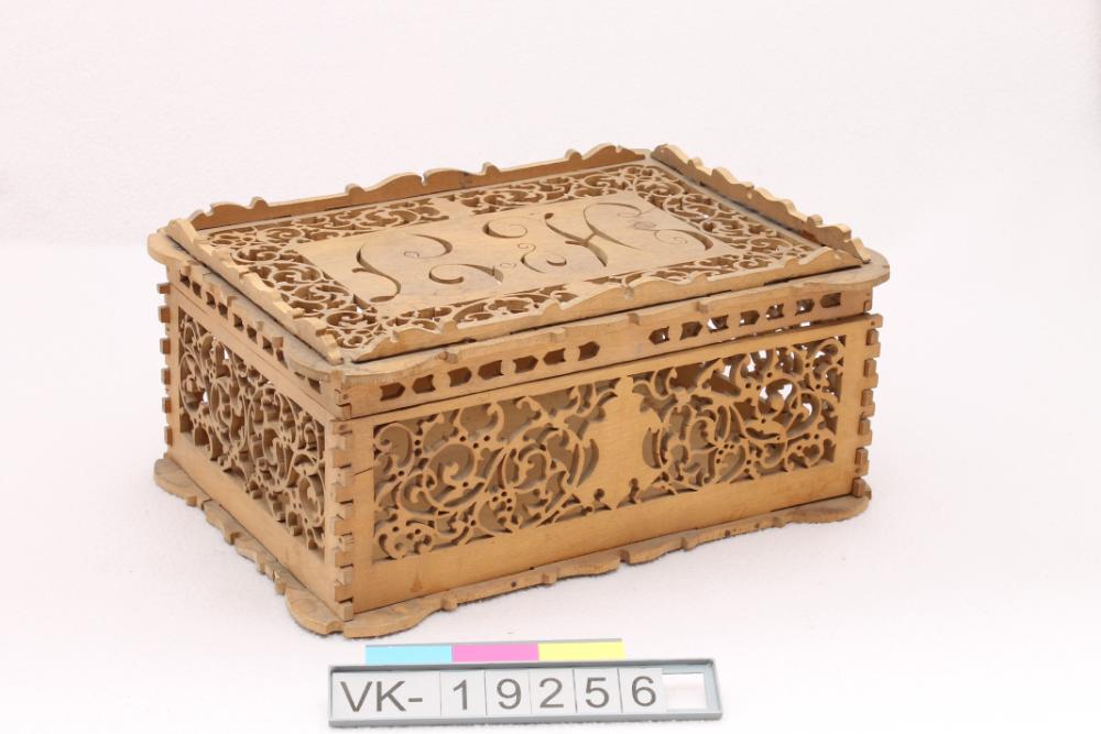 Schatulle mit Klappdeckel, die Schatulle ist aus Sperrholz gefertigt, an allen Seiten und am Deckel sind durchbrochen ornamental gestaltete Bereiche. Auf dem Deckel sind in einem Feld Initialen: "LH" ausgesägt.