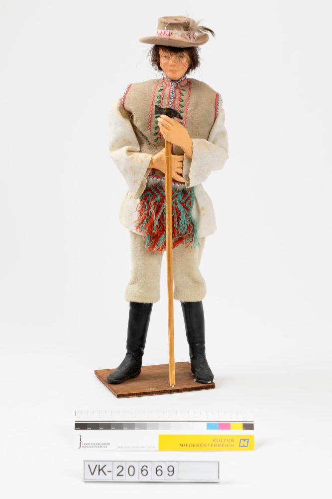 Männliche Figur ("Ruthene") in Tracht mit schwarzen Stiefeln, beigem Hemd und beiger Hose, einer gemusterten Weste und einem Hut mit Feder. Die Figur hält ein Hackwerkzeug mit langem Stiel und ist auf einer Holzplatte befestigt.