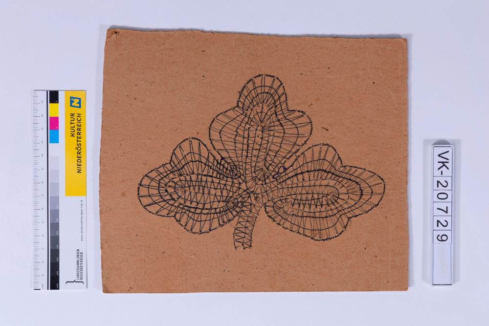 Klöppelbrief mit einem gezeichneten Muster in Form eines Blattes, gelocht. Das Muster ist wie bei Objekt VK-20578 und VK-20756. Fr. Bracher veranstaltete in den 1970er- und 1980er-Jahren Klöppelkurse über den ÖFB.