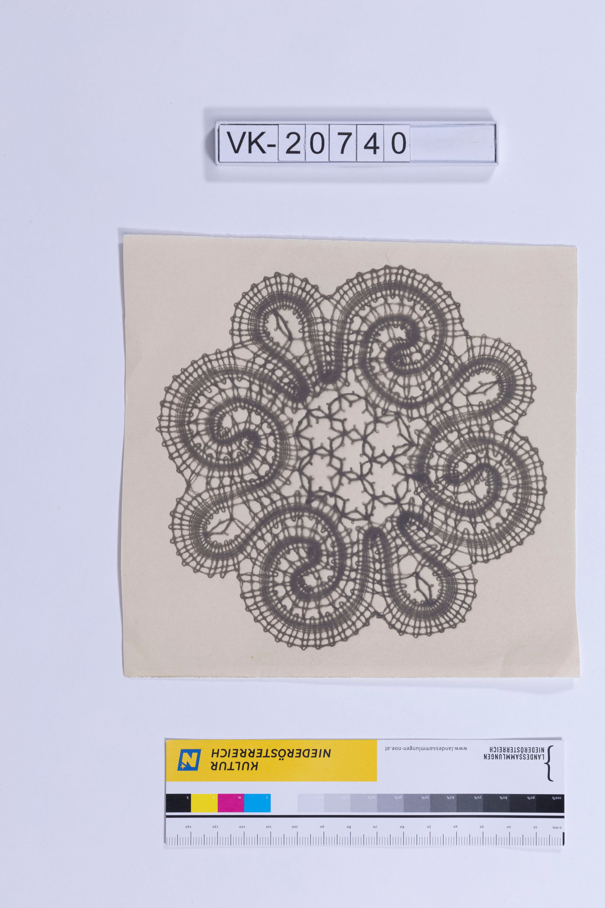 Vorlage mit einem runden Spitzendeckchen (belichtetes Fotopapier) mit mäanderndem Muster, für einen Klöppelbrief. Das Muster entspricht dem Muster des Objekts VK-20726. Fr. Bracher veranstaltete in den 1970er- und 1980er-Jahren Klöppelkurse über den ÖFB.