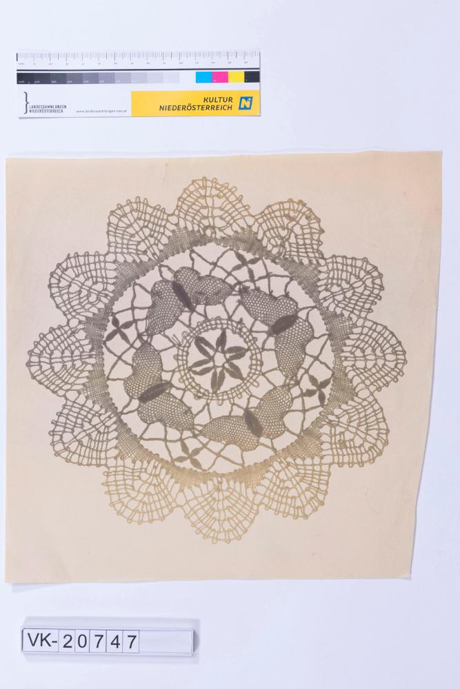 Drei Vorlagen für Klöppelbriefe: Abbildungen eines runden Spitzendeckchens (belichtetes Fotopapier). Fr. Bracher veranstaltete in den 1970er- und 1980er-Jahren Klöppelkurse über den ÖFB.