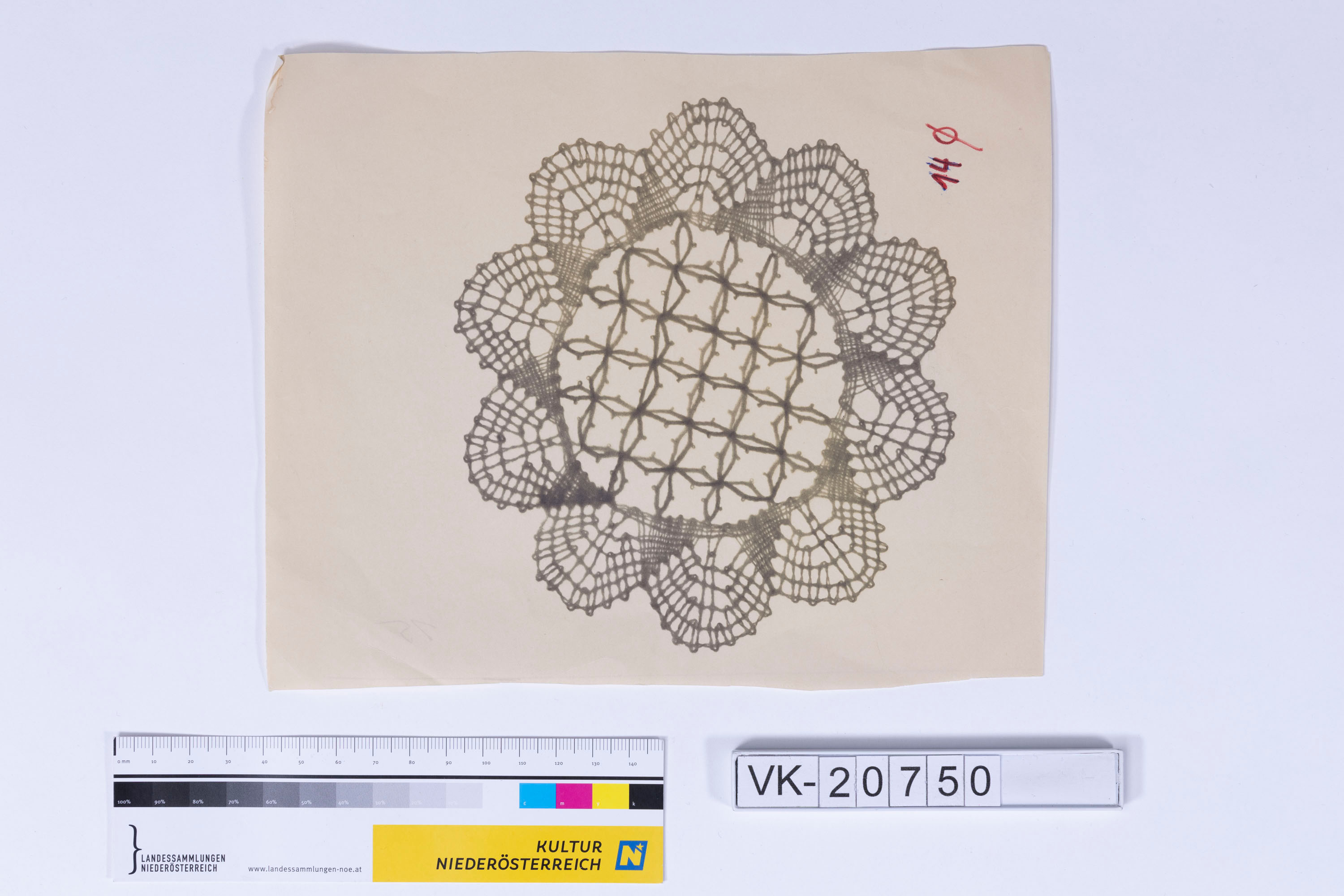Vorlage für einen Klöppelbrief: Abbildung eines runden Spitzendeckchens (belichtetes Fotopapier). Es handelt sich um das Deckchen, das auf VK-20748 kopiert ist, wie VK-20754. Auf der Rückseite eine Preisnotiz: "15.-" (ATS). Fr. Bracher veranstaltete in den 1970er- und 1980er-Jahren Klöppelkurse über den ÖFB.