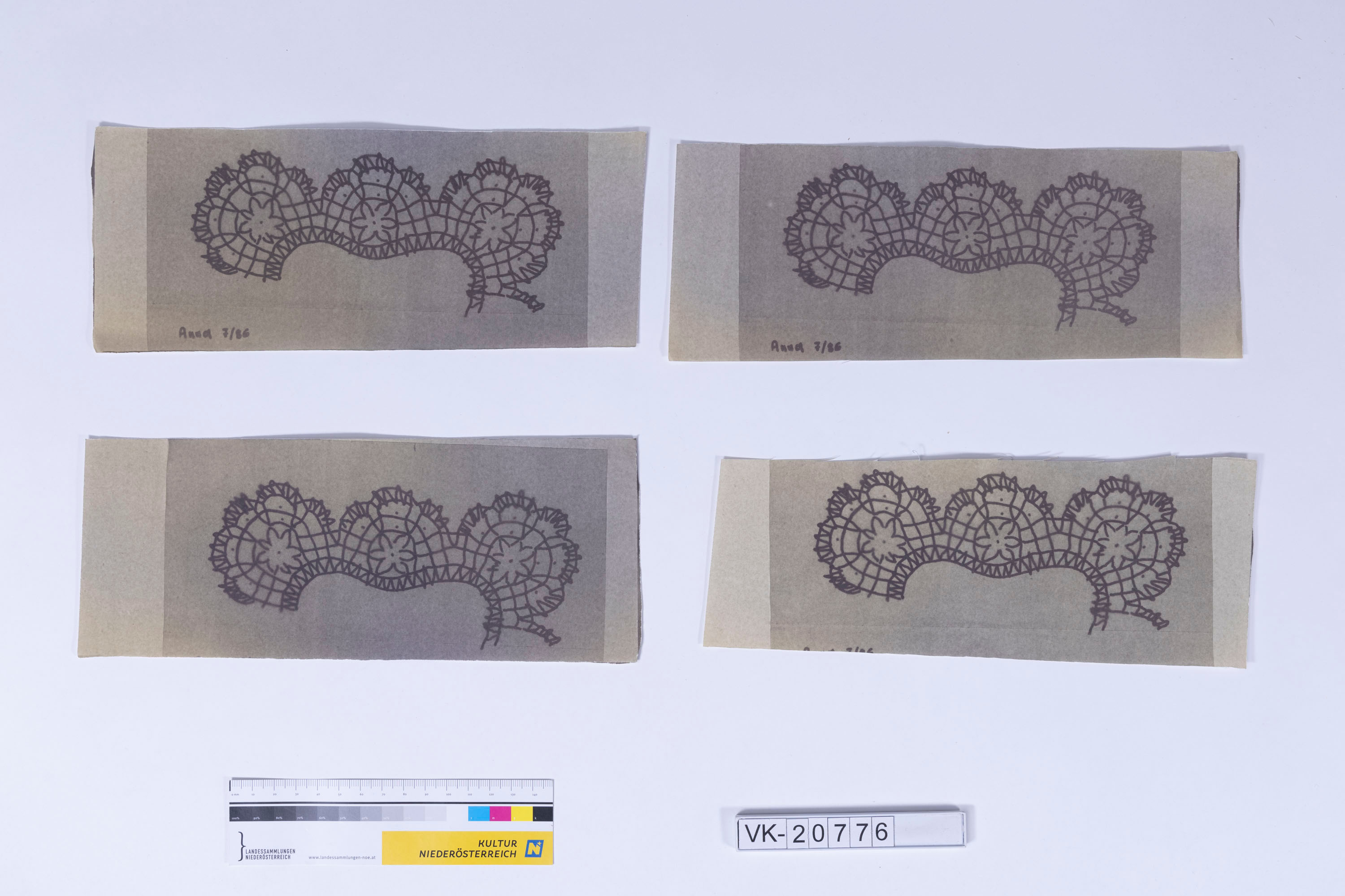 Vier Klöppelbriefe: Zeichnung eines Bortenmusters, wie beim Original VK-20758. Fr. Bracher veranstaltete in den 1970er- und 1980er-Jahren Klöppelkurse über den ÖFB.