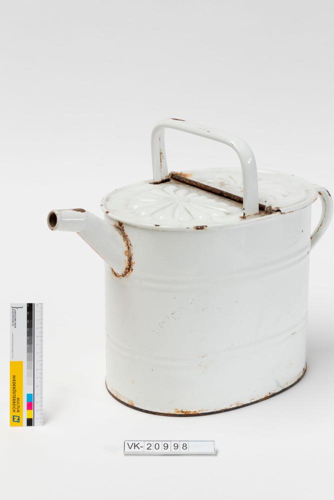 Gießkanne mit ovaler Grundfläche und gerader Wandung, eine Henkel und ein Tragegriff. Die Gießkanne hat eine palmettenverzierte Abdeckung, die zum Teil hoch geklappt werden kann, und eine Tülle. Am Boden hat die Kanne eine Herstellermarke: "... MÖDLING".
