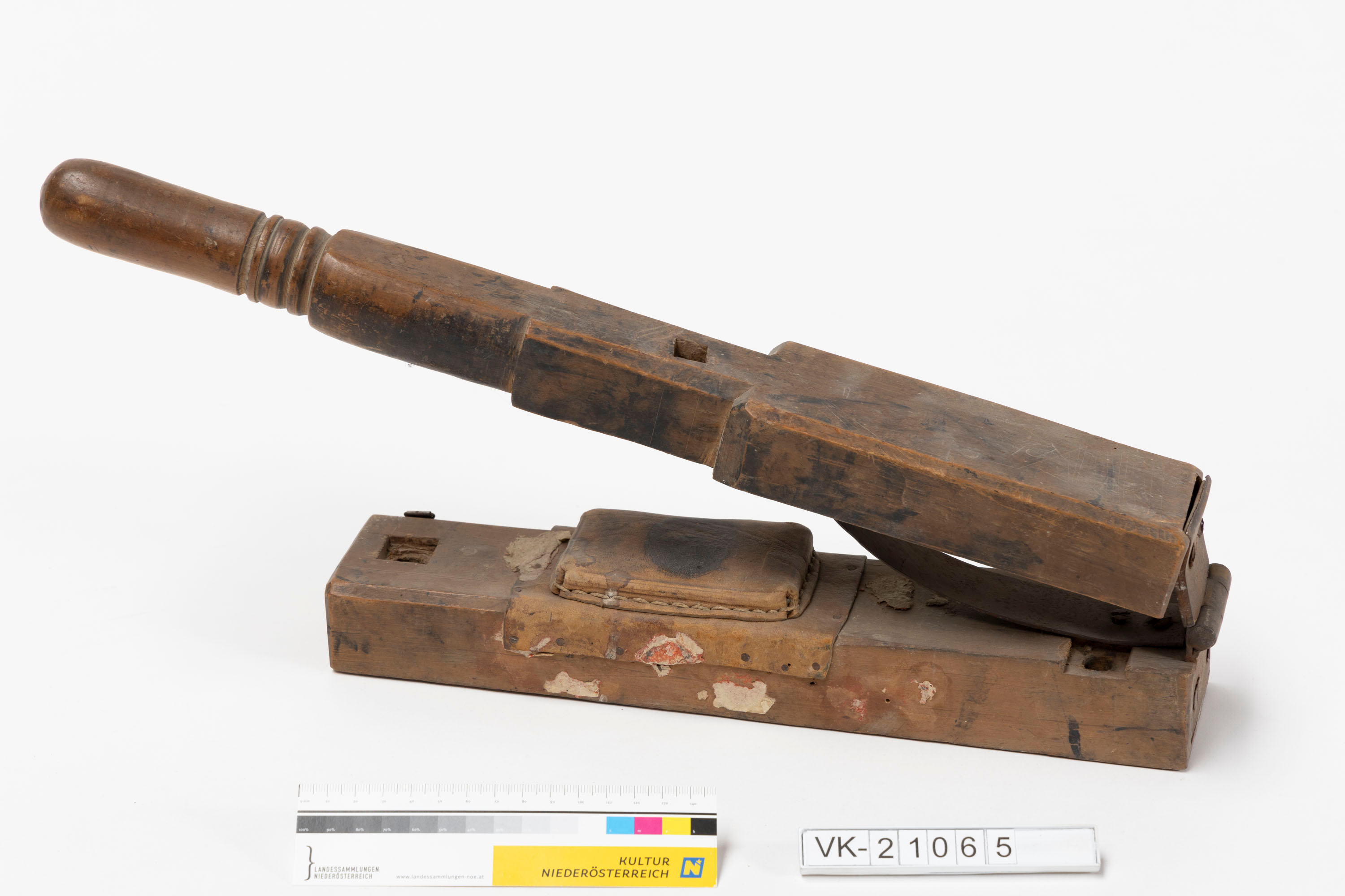 Massiver Nussknacker aus einer Holzbasis mit Lederauflage, einem Handhebel mit Scharnier und einer Blattfeder. Die Basis hat drei Öffnungen für eine ehemalige Verschraubung, in den Hebel konnte vermutlich ein Werkzeug eingesetzt werden.