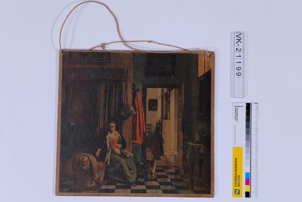 Mehrfärbiger Druck, auf eine Pressspanplatte geklebt: Innenansicht einer Wohnung mit Frau, Kind und Hund.