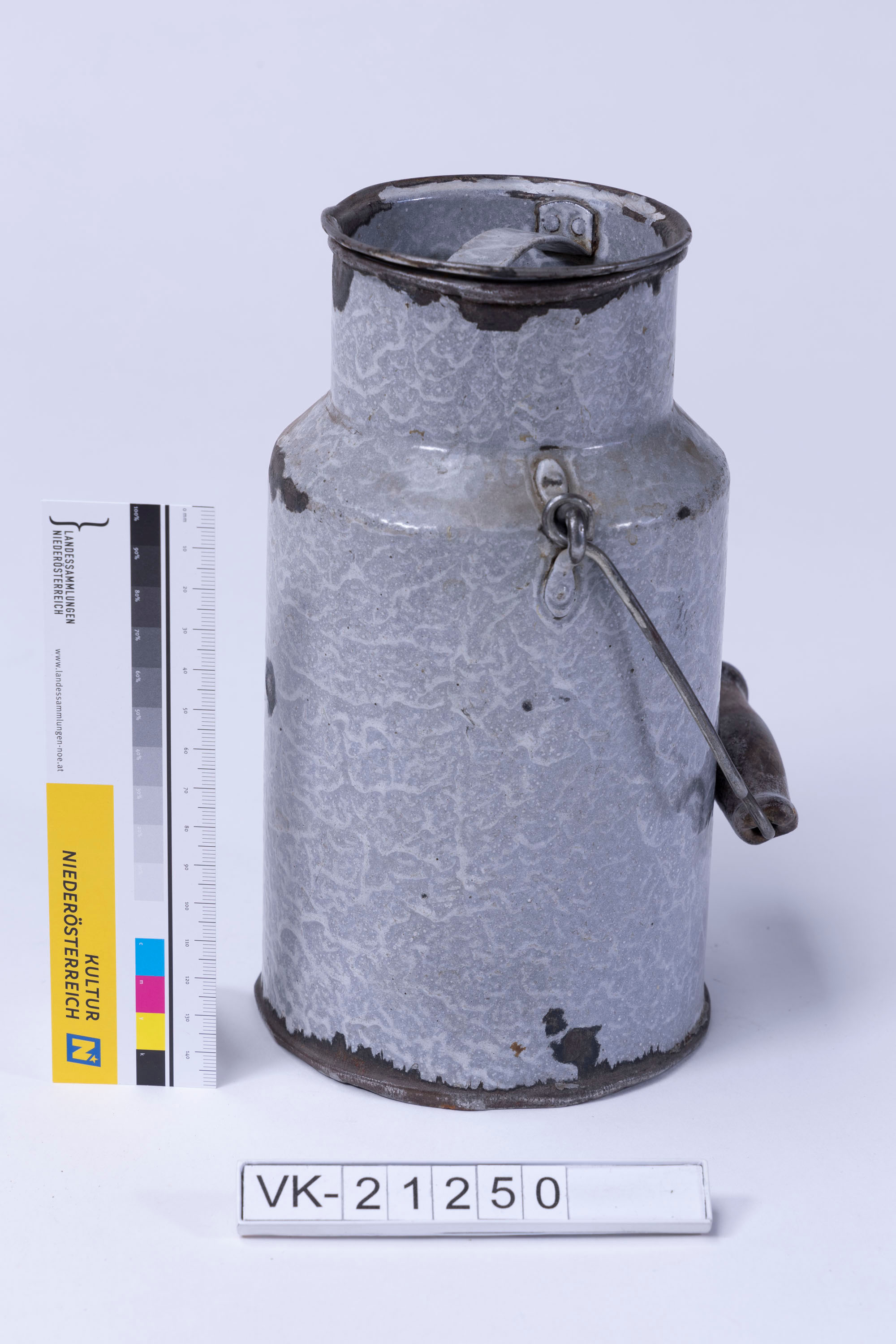 Zylindrische Milchkanne (VK-21250a) mit Deckel (VK-21250b), grau marmoriert emailliert, mit einem Henkel und einem Tragegriff aus Holz. Auf dem Boden befindet sich ein Aufdruck: "FLEISCHMANN MÖDLING", Markenzeichen mit gekreuzten Schwertern, "1 1/2".
