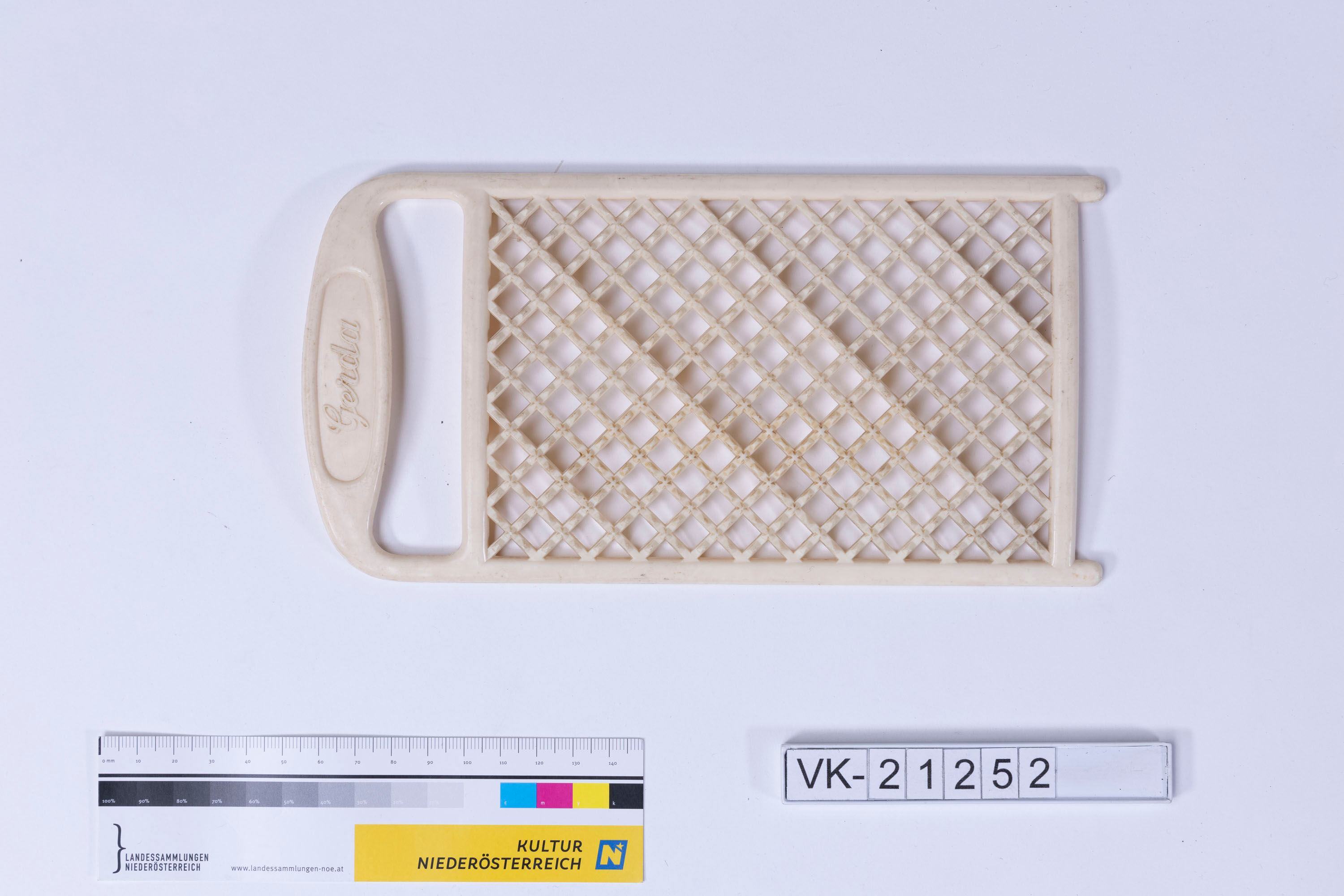 Rechteckige Reibe aus weißem Kunststoff, mit profiliertem Gitter und einem Haltegriff mit Aufschrift: "Gerda".