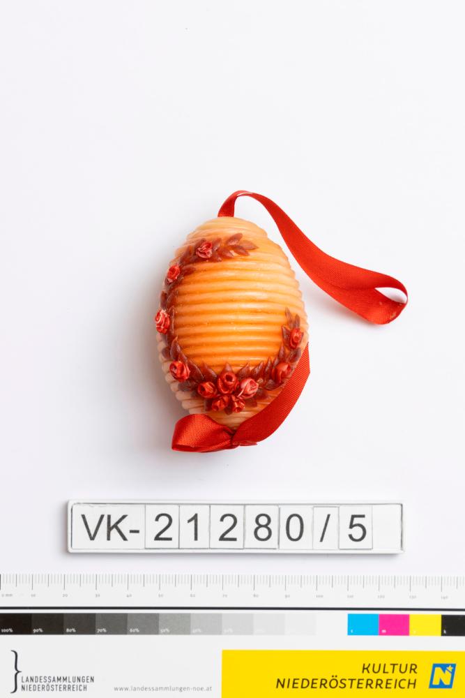 Osterei: Ausgeblasenes Hühnerei, vollflächig mit einer Wachsschnur umwickelt, mit einem Blätterkranz mit Rosenblüten bossiert. Das Ei ist rötlich gefärbt und hat eine rote Schleife.