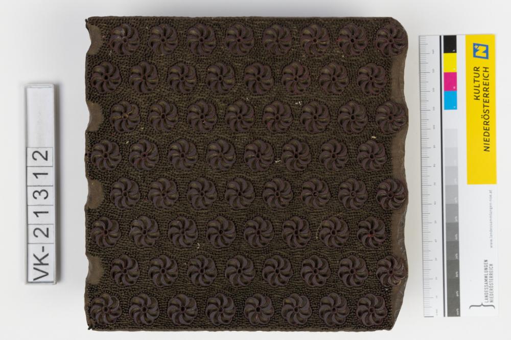 Färbermodel aus Holz mit eingeschlagenen Metallstiften auf einer Trägerplatte mit zwei Kerben. Druckmuster: Rosetten, dazwischen feine Pünktchen, mit Resten roter Farbe.