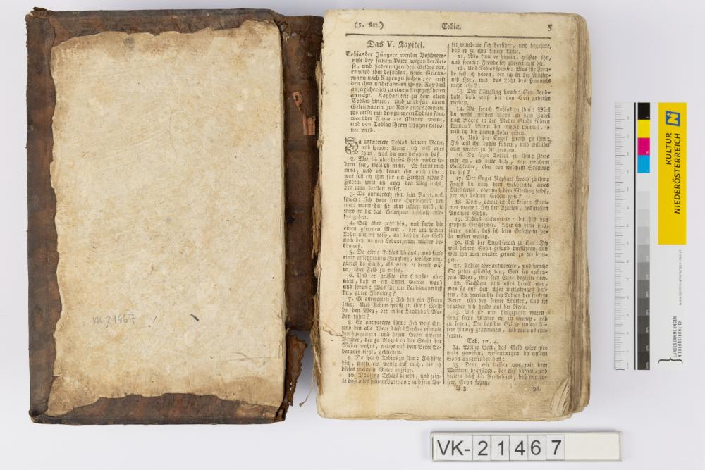 In braunem Leder gebundene Bibel, nicht vollständig (Seiten 5-630). Im hinteren Umschlag ist ein rosa Papier, handschriftlich beschriftet: "Rosalia Droiß von Kollnbrunn".