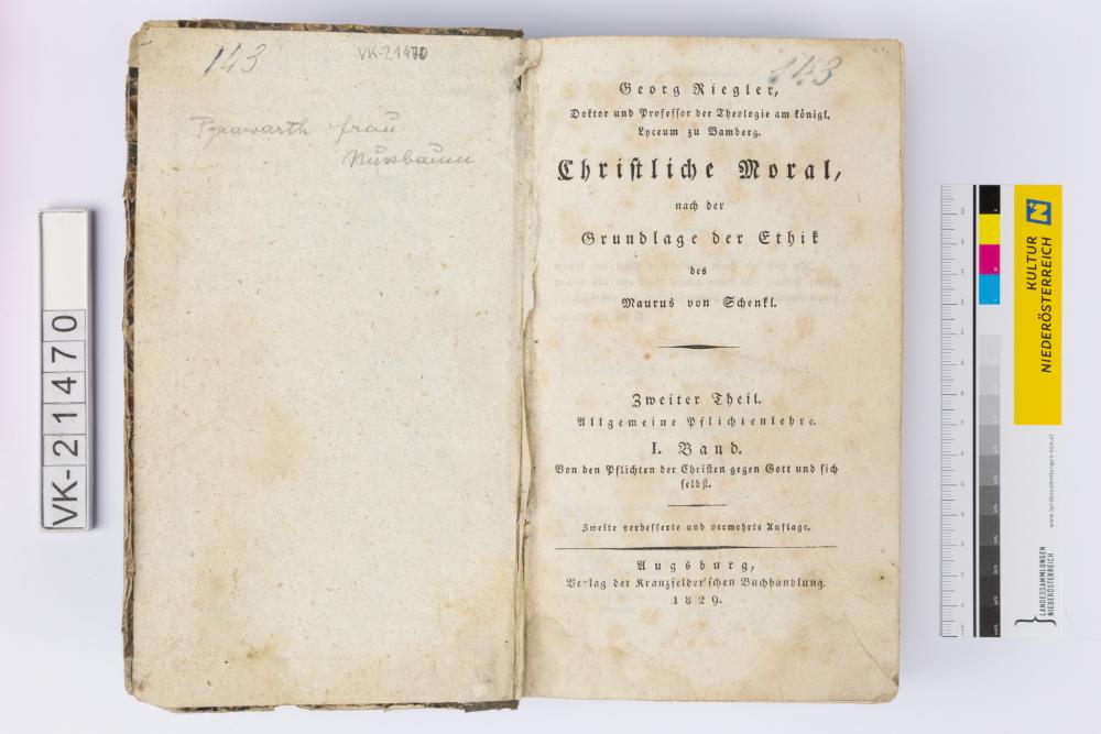 Buch in einem braun marmorierten Kartoneinband mit Leinenrücken "Christliche Moral nach der Grundlage der Ethik des Maurus von Schenkl", 676 Seiten.